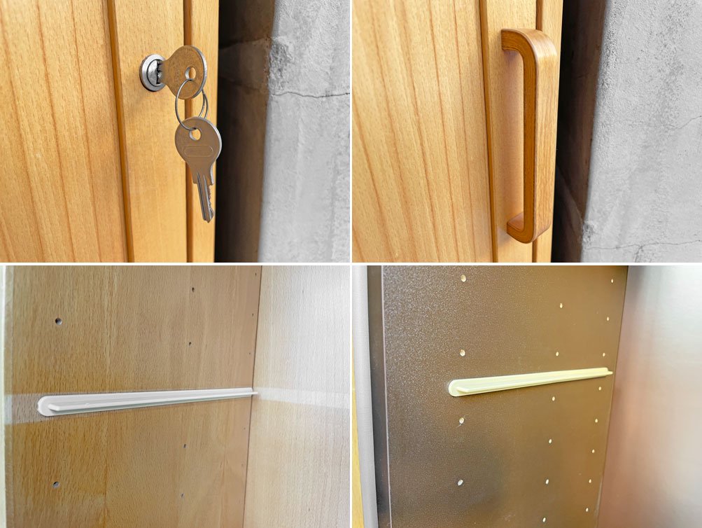 キャビネットは蛇腹扉仕様、またこちらもレール付きのため物の出し入れがしやすく、鍵付きなので貴重品の保管にも適しています。
