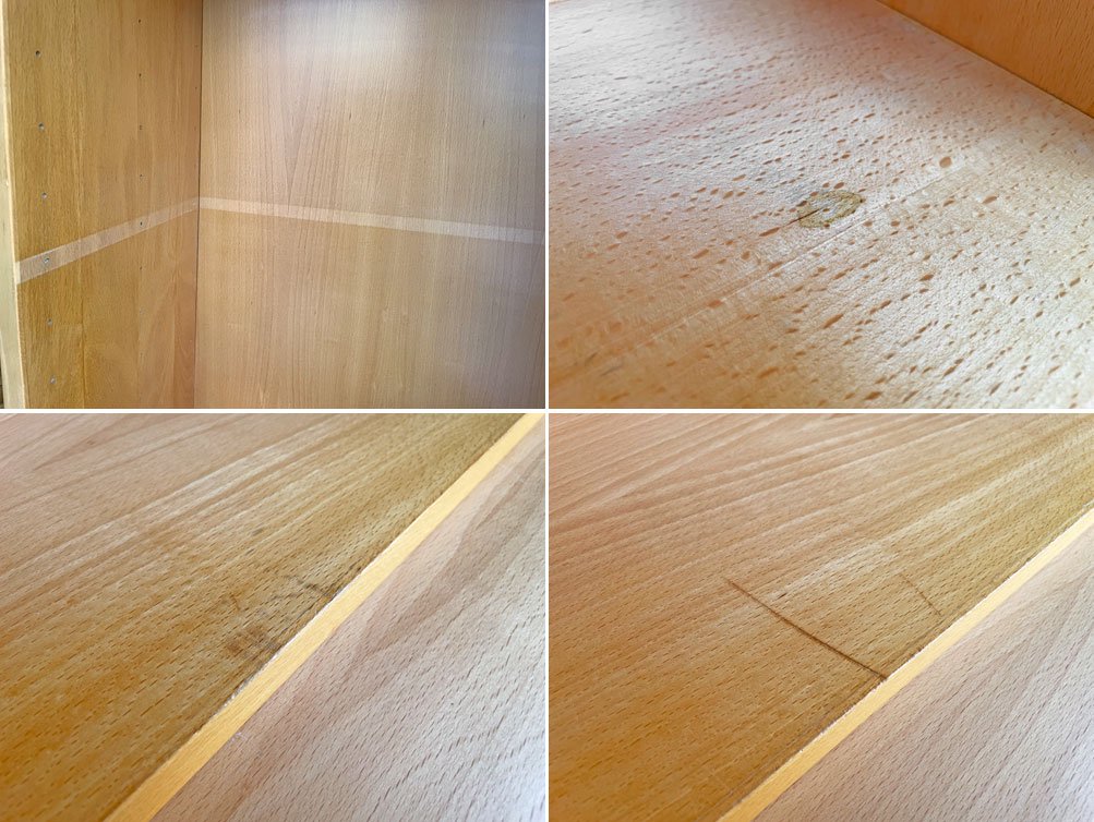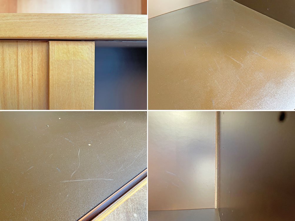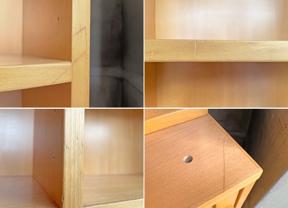使用に伴う複数の傷や打痕、ペイント痕や棚板の日焼け跡が見受けられます。下段収納内の背板に若干のぐらつきがございますが、使用や強度に問題はございません。USED品として概ね良好なコンディションを保っております。
