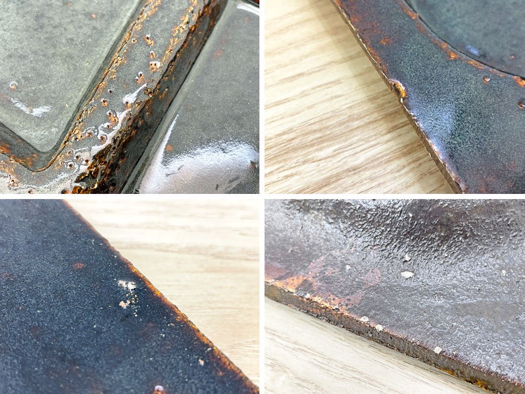 全体のホツと表面一箇所に目立つくぼみの他、縁の一箇所にチップ、釉薬のムラや軽微な剥がれが見られるものの、いずれも製造時に出来たものですので、お使いいただく上で問題はございません。