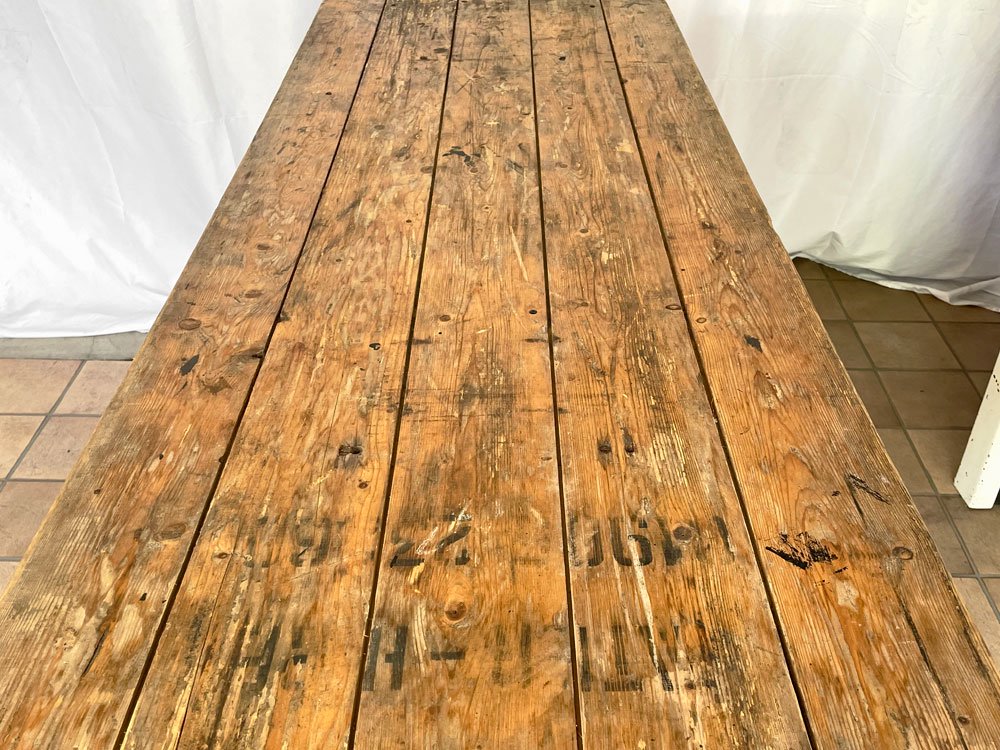 経年により唯一無二の枯れた風合いとなったパイン古材の天板。節の抜けや古材ならではの凹凸、消えかかったステンシルも雰囲気は抜群です。