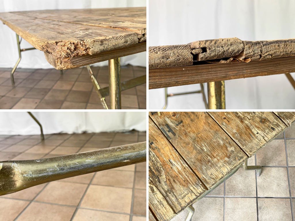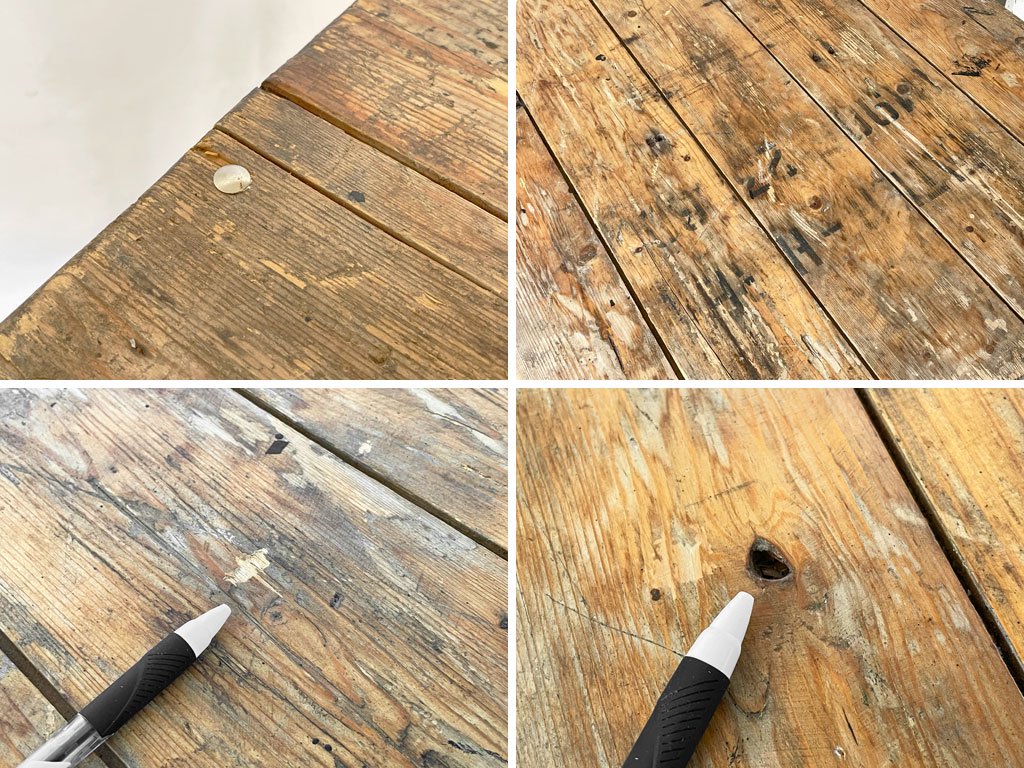 こちらはビンテージ品です。天板には古材特有の凹凸、クラック、汚れ、削れや節の抜けが見られますが、味としてお楽しみ頂けるかと思います。また、使用上問題となるぐらつき等も無く、これからも問題なくお使い頂けるコンディションです。