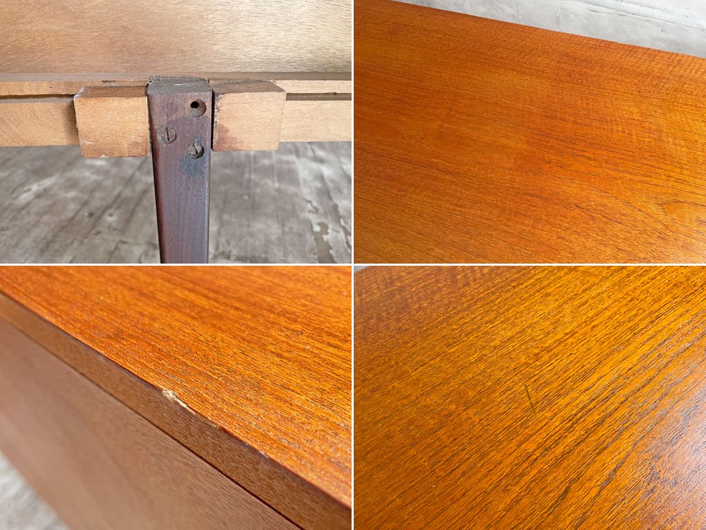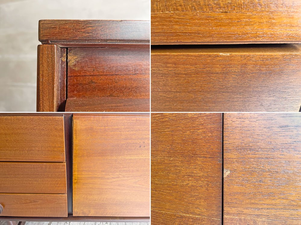 使用による傷や打痕、天板部分の日焼け、天板の縁付近や左側の扉に突板剥離の補修跡が見受けられます。そのほか、脚部のビスが全箇所1本だけ抜かれておりますが、現状で強度面での問題はございません。使用に問題となるダメージは無く、ビンテージ品として概ね良好なコンディションを保っています。