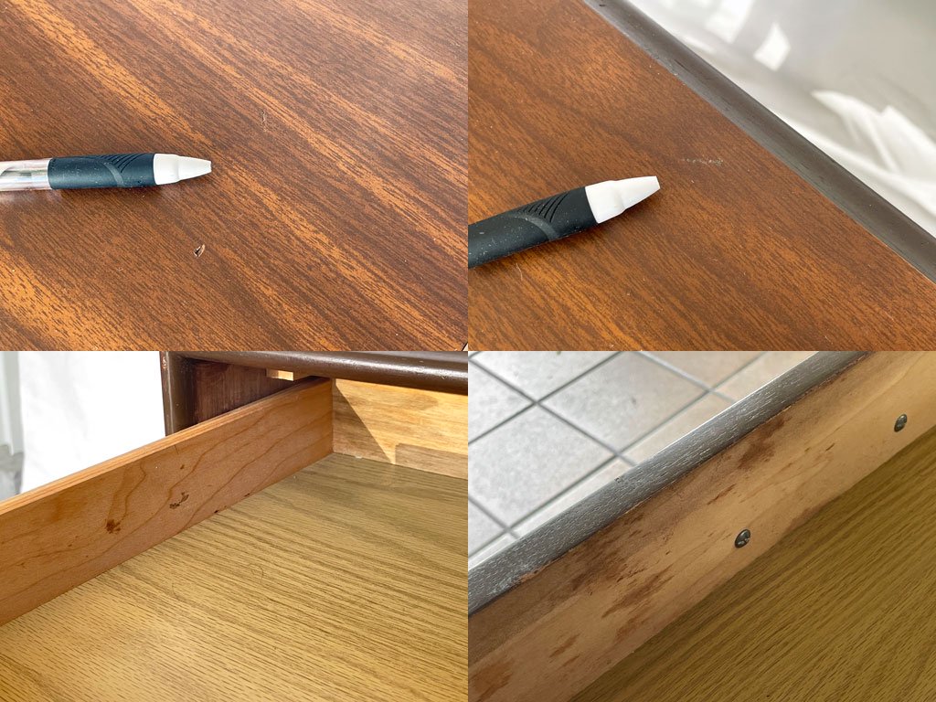 こちらはビンテージ品です。天板、棚板や角を中心に擦れ、打痕、若干の色むらやペイントロス等経年なりのダメージが散見されますが、美観を大きく損ねるものではございません。若干のがたつきはありますが使用の支障となる程では無く、その他大きなダメージの見受けられない概ね良好なコンディションです。
