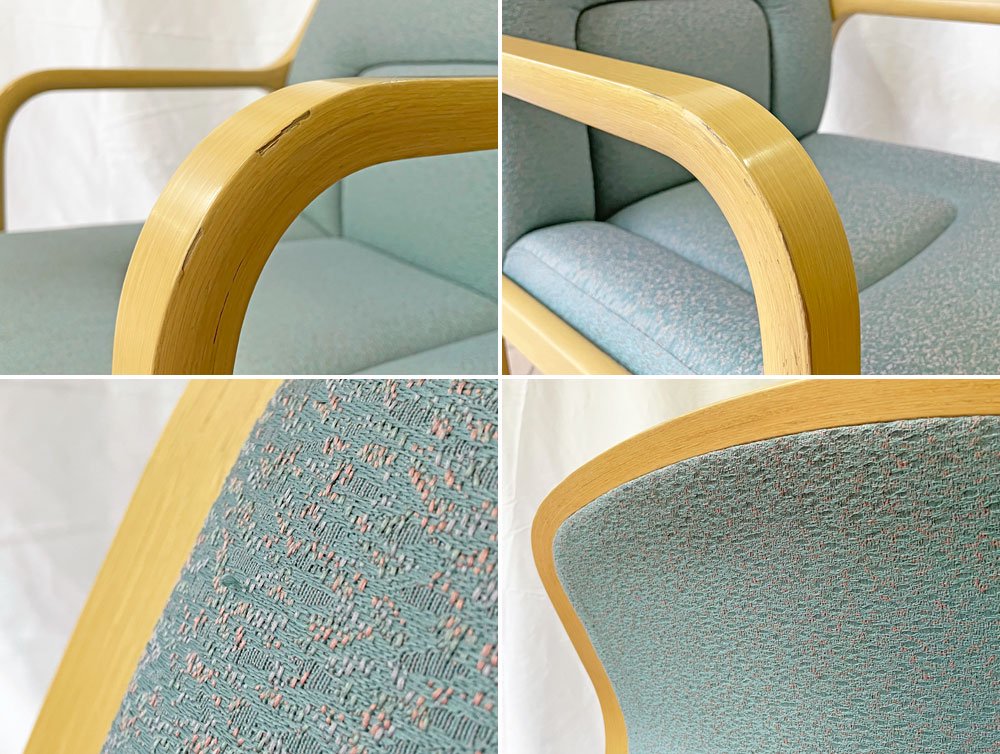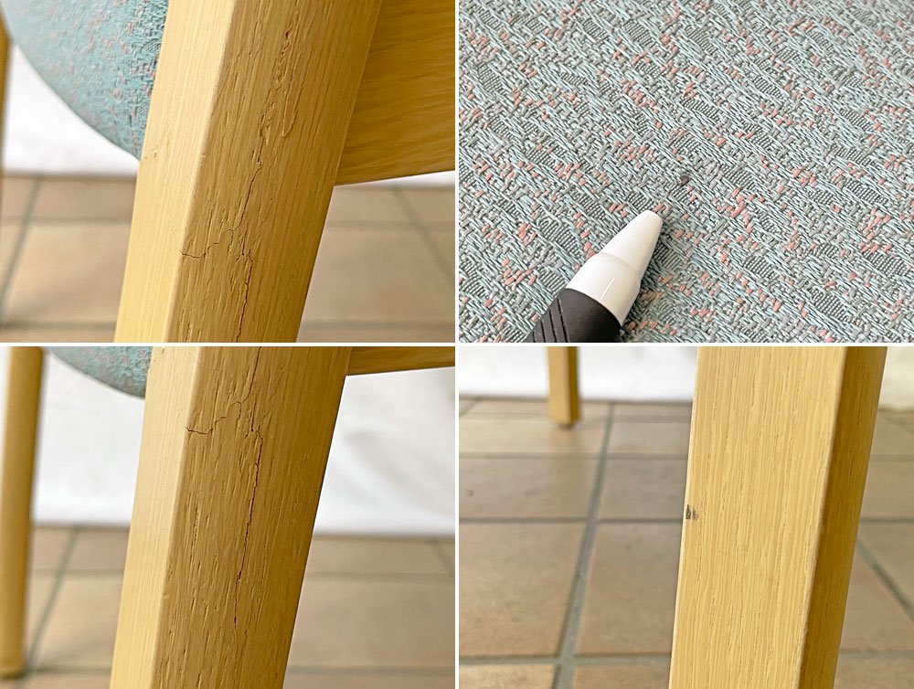 使用に伴う擦れ傷の他、細かな打痕、ファブリックの小さな染み、ほつれ、突板の小さな割れ欠けや脚先の黒ずみ等ございますもののいずれも大きく目立つものではございません。また背もたれの後ろ側にはわずかにウレタンのへこみ、右アームの後ろ脚にはやや大きなヒビが表面に見受けられます。現状ご使用に問題を感じるものではございませんが、コンディションを鑑みお求めやすいお値段での販売となります。予めご承知の上ご検討下さいますようお願い申し上げます。
