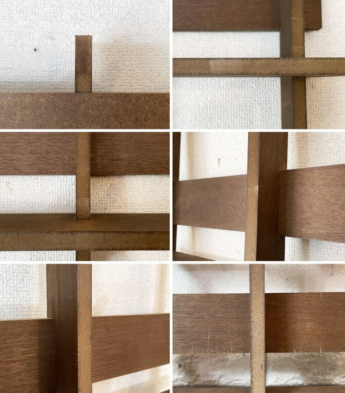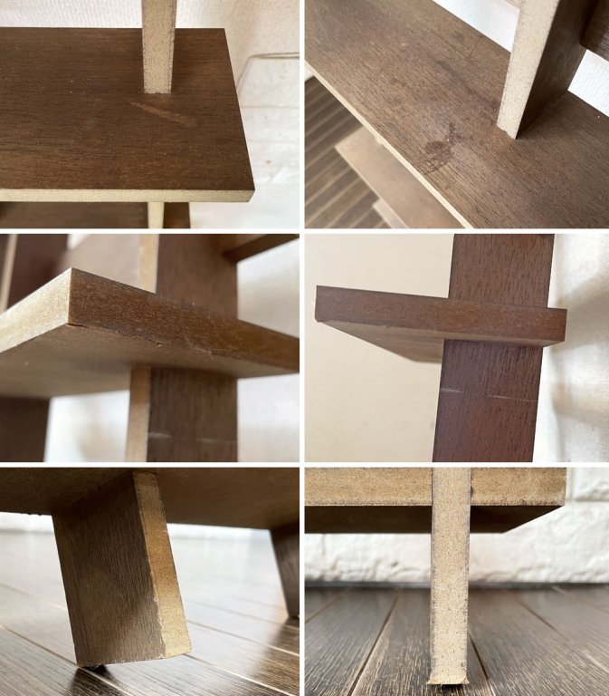 使用に伴う、擦れや傷、縁の削れ、木部の欠け、木色のムラやシミ汚れ等が見受けられるとともに、縦方向にややたわみがございます。なお、棚板はすべて差し込み式となり、構造上若干のぐらつきが生じる場合がございますが、壁に立てかけ物をのせることで安定感が増します。ご使用には問題なく、これからもまだまだ実用頂けるコンディションを保っております。
