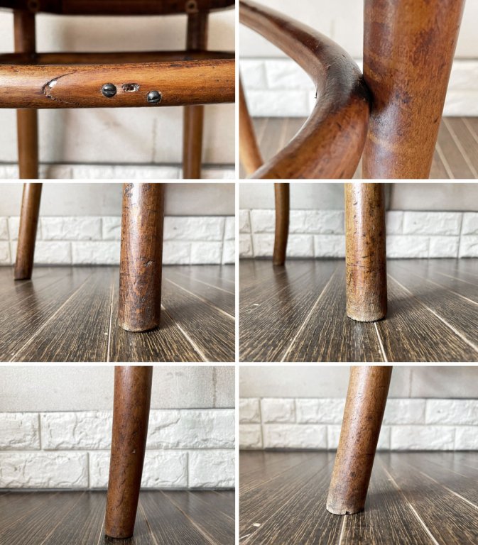 こちらは、ビンテージのお品物です。全体に擦れや傷、木色のムラ、黒ずみなどの取り切れない汚れ等が散見されます。また、一部木部の欠けや亀裂、座面の浮き、割れの補修痕などが確認できますが、現状通常の着座使用に問題はございません。