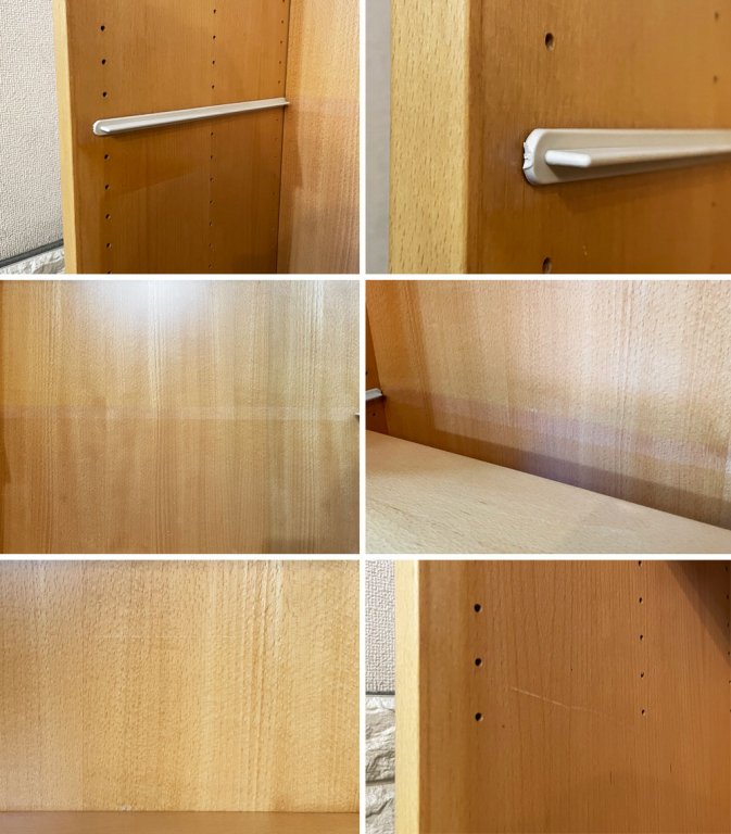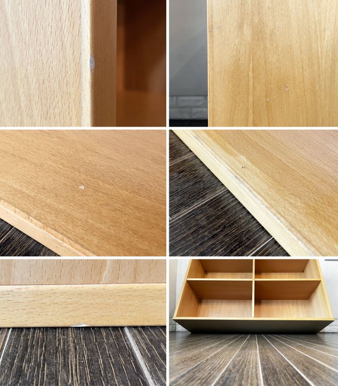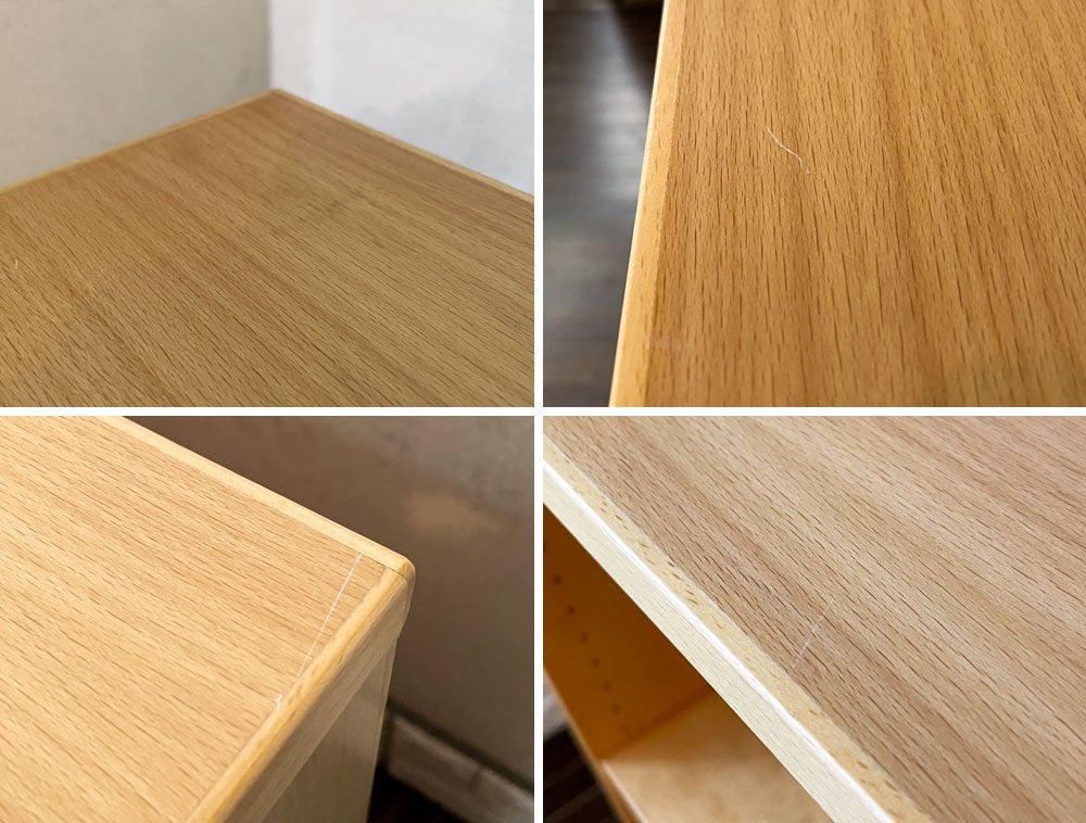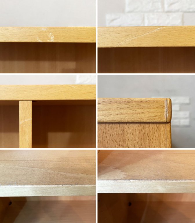天板やフレームにやや目立つ線傷や擦れ傷が数カ所確認できるとともに、縁の削れや打痕がございます。また、背板の内側には天板のヤケ痕が見受けられます。その他、使用に伴う擦れや傷、黒ずみ汚れ等はございますが、ご使用に問題となるダメージはございません。今後も安心してお使い頂けるコンディションを保っております。