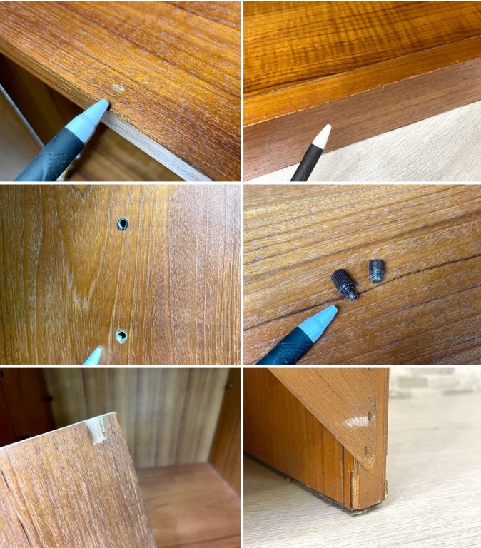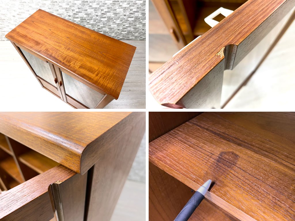 こちらはビンテージ品となります。使用に伴う擦れ傷の他、染み、打痕、棚板ヤケ、スクラッチ、突板のヒビや剥がれ等がございますがいずれも大きく目立つものではございません、また下部シェルフ用の棚板2枚が欠品しておりネジダボのいくつかがネジ孔と共に別の物へと換装されております。ご使用に問題となるようなダメージは無く、引き続きビンテージの風合いをお楽しみ頂けるコンディションとなっております。