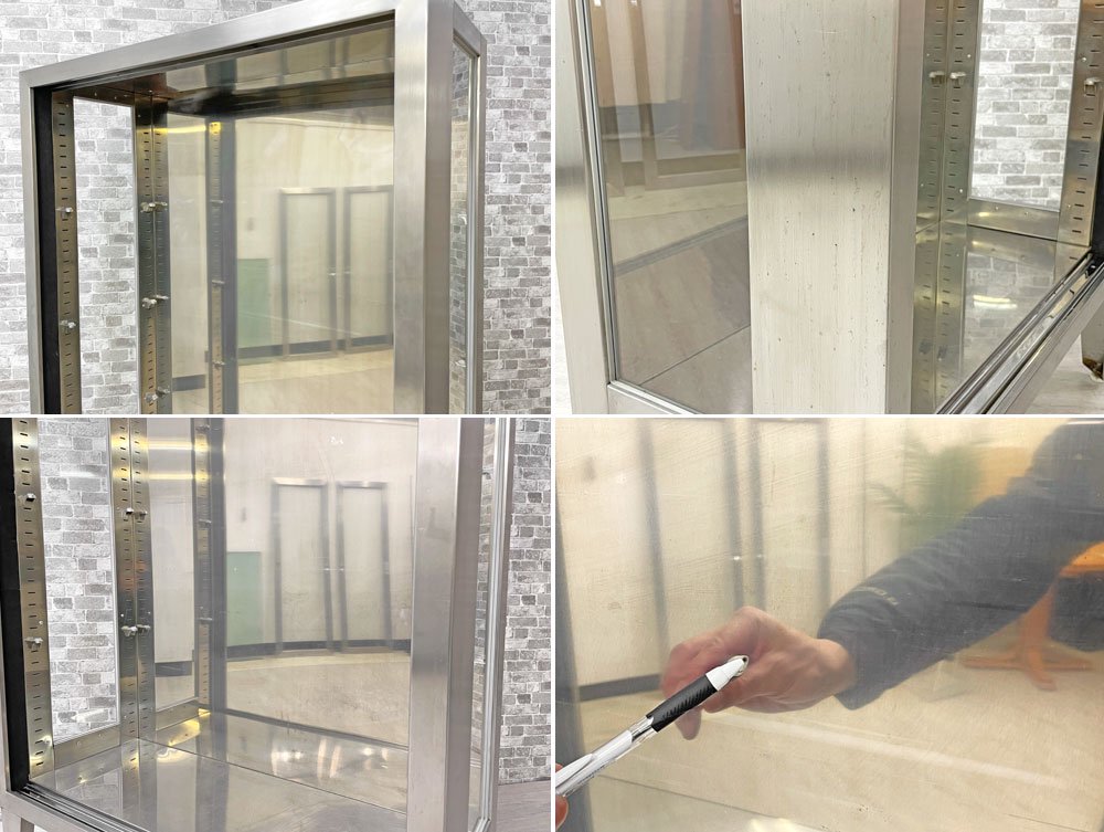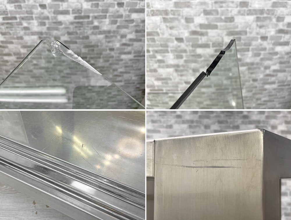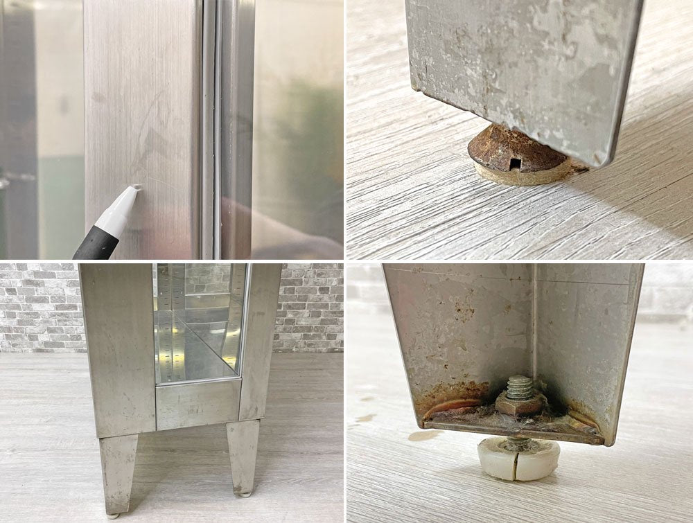 使用に伴う擦れ傷の他、全体的にくすみ、染み、黒ずみ、サビ、スクラッチ、線傷、ガラスには角を中心に目立つチップが複数箇所見受けられ、また脚先グライズのプラスティックに欠損があり代用としてフェルトが貼られている等強い使用感がございます。ガラス棚板は普段のご使用時に手を触れやすい箇所にはございませんが、棚板の調整などの際はお気を付け下さいませ。上記コンディションではございますが堅牢な造りもあり、ご使用に問題となるようなダメージはございません。状態を鑑みお求めやすい価格での販売となりますので、上記をご留意の上ご検討下さいますようお願い申し上げます。