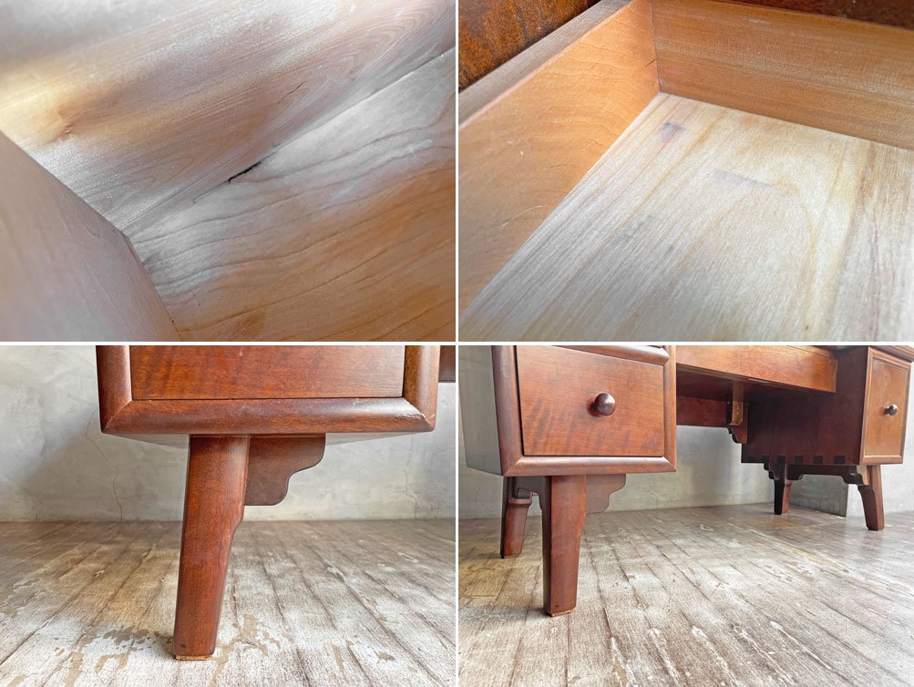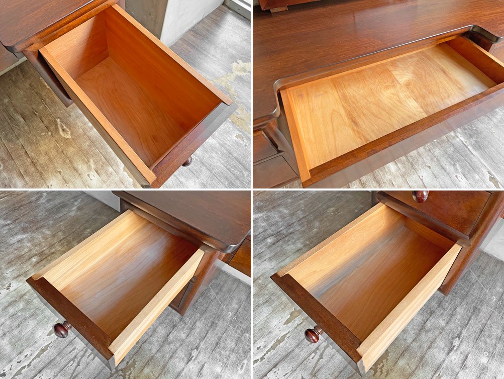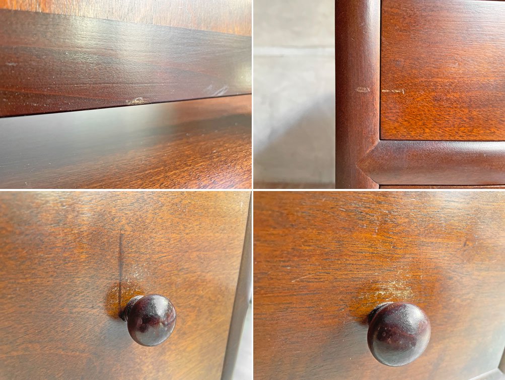 使用に伴う擦れや傷、打痕が若干見受けられます。また、引き出し内部に化粧品の匂い、クリーニングでは落ち切らない若干のペイント跡がございます。
