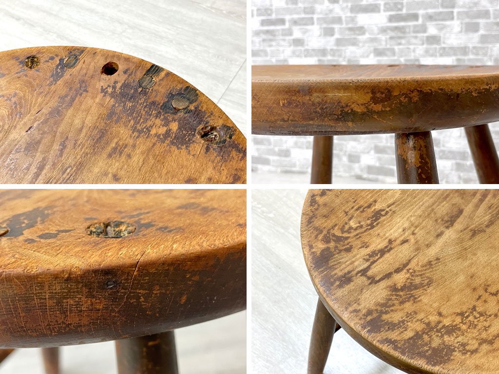 こちらはビンテージ品となっております。経年に伴う擦れや傷、染みや色ムラ、ペイントロス等が全体的に見受けられ、一部木部の僅かな割れがございます。また本来スポークバックが付いており、背もたれのある椅子だったかと思われますが、後年に取り外され現在はスツールタイプとなっております。予めご了承くださいませ。その他機能に問題あるような箇所はございません。