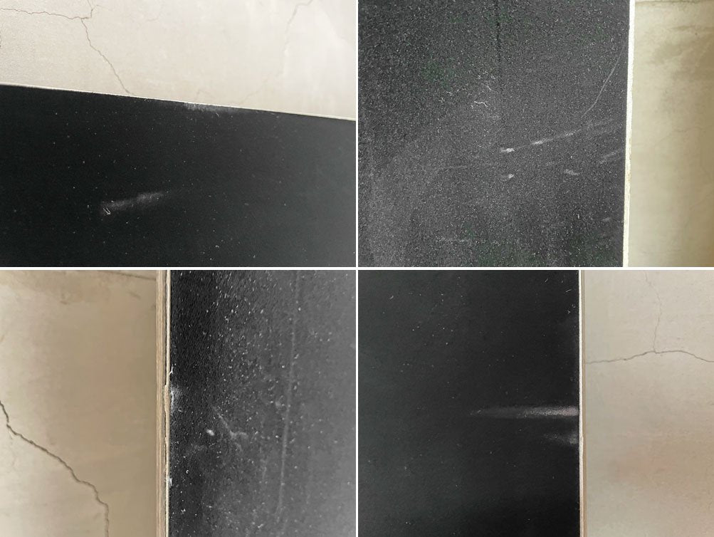 使用に伴う複数の傷や打痕、ペイントの剥がれや裏面布地の凹みや擦れが見受けられます。