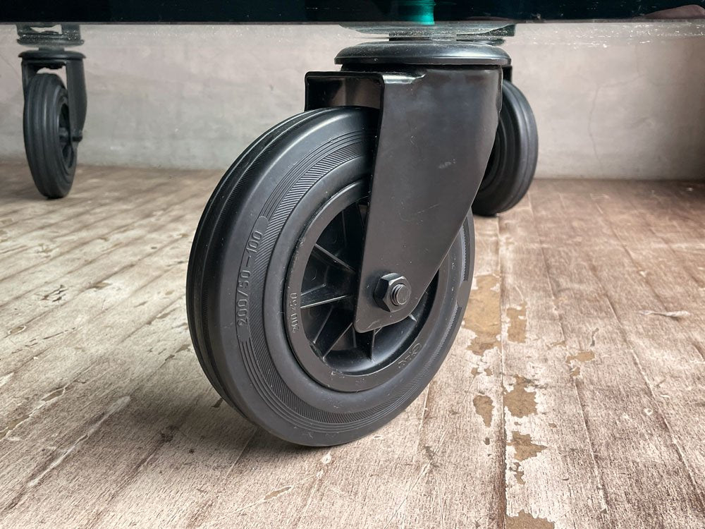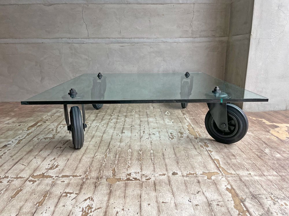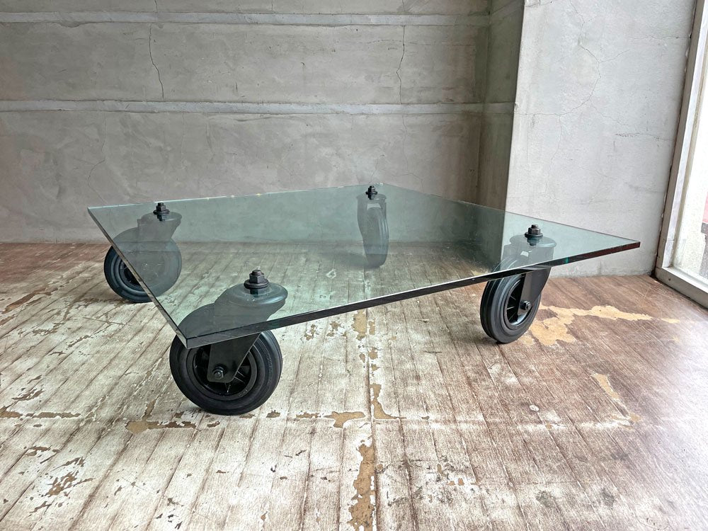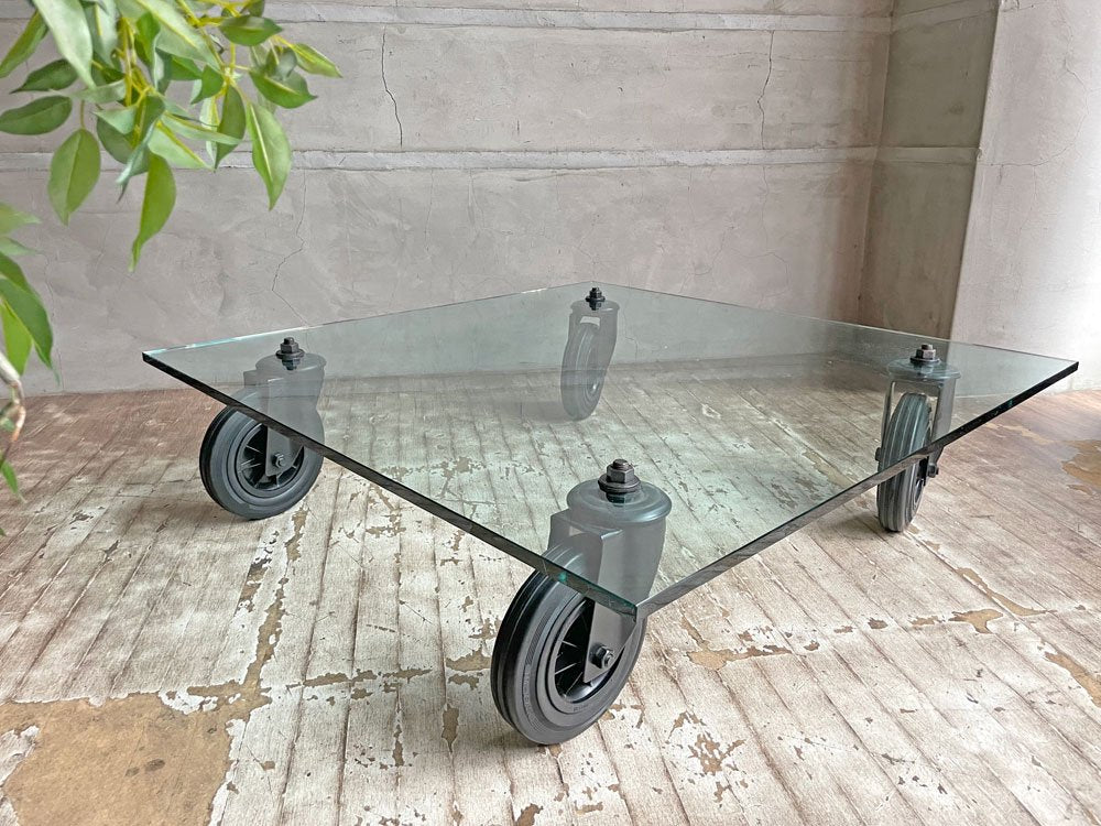 1932年、イタリアのデザイナージオ・ポンティにより設立された”フォンタナアルテ Fontana Arte”より、『コンルオーテ CON RUOTE』ガラスローテーブルのご紹介です。ガラス天板と車輪を用いたシンプルかつ斬新なデザインで、名作と名高いローテーブルの一つです。