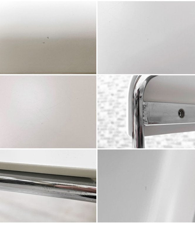 ホワイトのスチール天板に細身の脚が組み合わされており、天板の両端はフレームに沿う様にカーブしたデザイン。見る角度で印象が変わるユニークフォルムです。