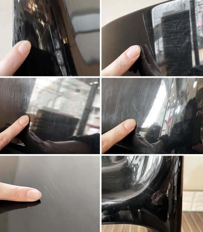 全体にやや目立つ線傷や縁の削れが見受けられるとともに、使用に伴う擦れや傷、取り切れない汚れ等が確認できます。なお、ご使用に問題となるがたつきやぐらつきなどはございません。今後も安心して実用頂けるコンディションを保っております。