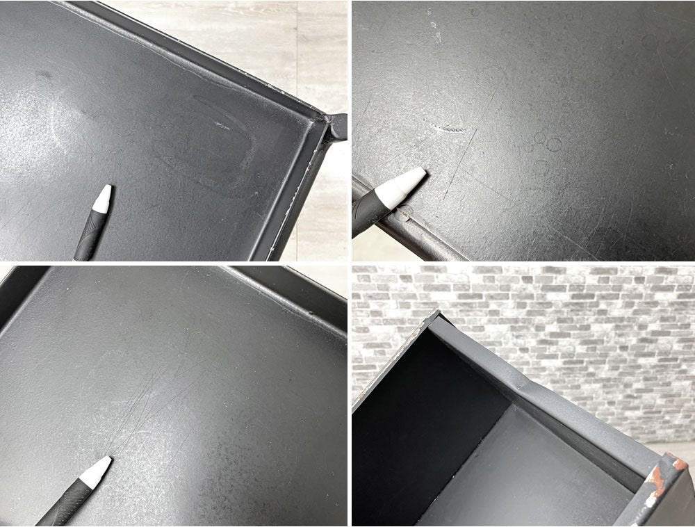 使用に伴う擦れ傷の他、スクラッチや線傷、塗装の剥がれやサビ、キッチン周りで使用されていたのか僅かに油のような臭いが感じられる等使用感がございます。もともとビンテージライクな仕上げのため大きく風合いを損なうものではございませんが、使用感を加味しお求めやすいお値段での販売となります。予めご了承の上ご検討下さいますようお願い申し上げます。