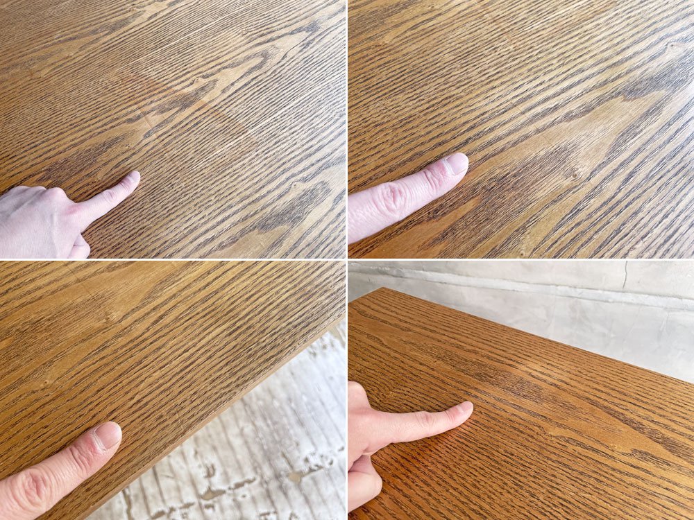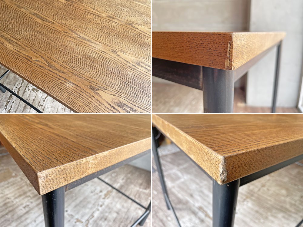 使用による打痕や線傷、天板部分に欠けや突板の剥がれ、まだらな色褪せやクリーニングで落としきれないシミが見受けられます。又、アイアン部分にペイントロスやサビが見受けられますが、製造時からの物と思われます。使用に問題のあるダメージは無く、概ね良好なコンディションを保っております。