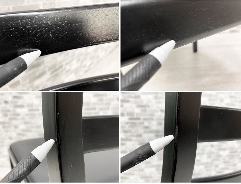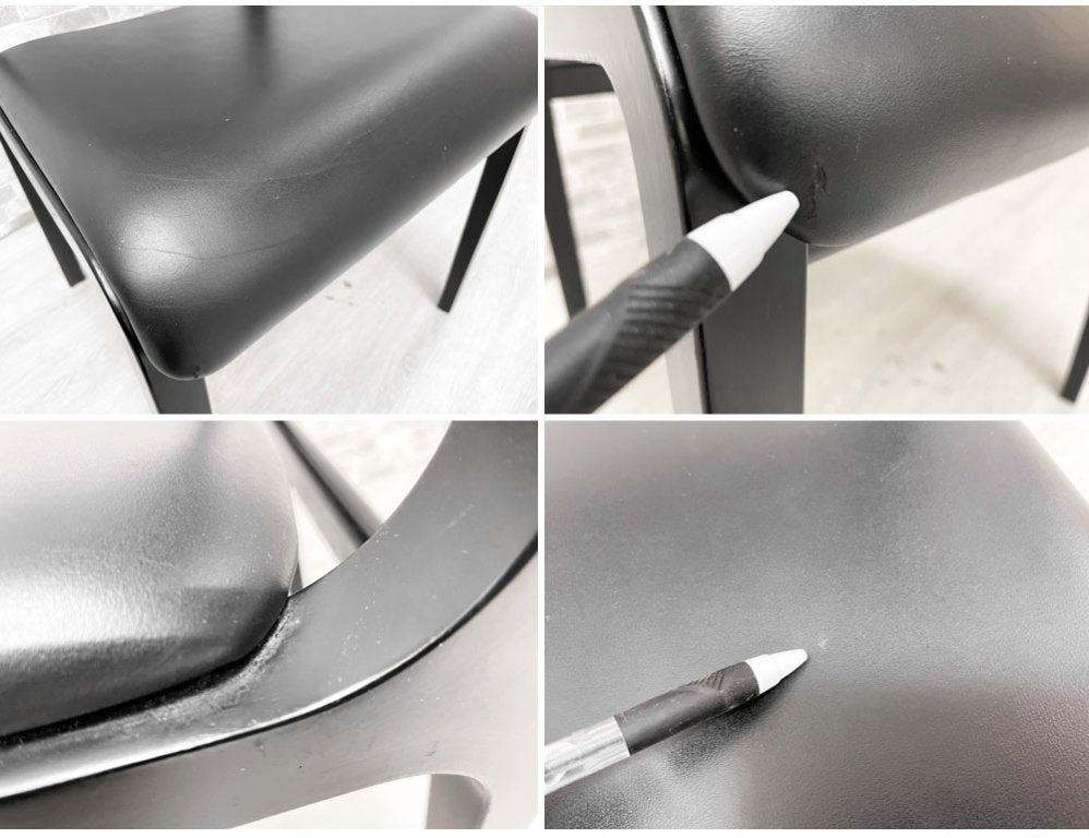 使用に伴い、フレームには擦れ傷や打痕、レタッチ痕等がございます。また、座面レザーシート表面の破れやシワなどがございますがいずれも大きく美観を損なうものではございません。グラつきといったご使用に問題となるダメージは無く、これからも問題なく実用して頂けるコンディションを保っております。
