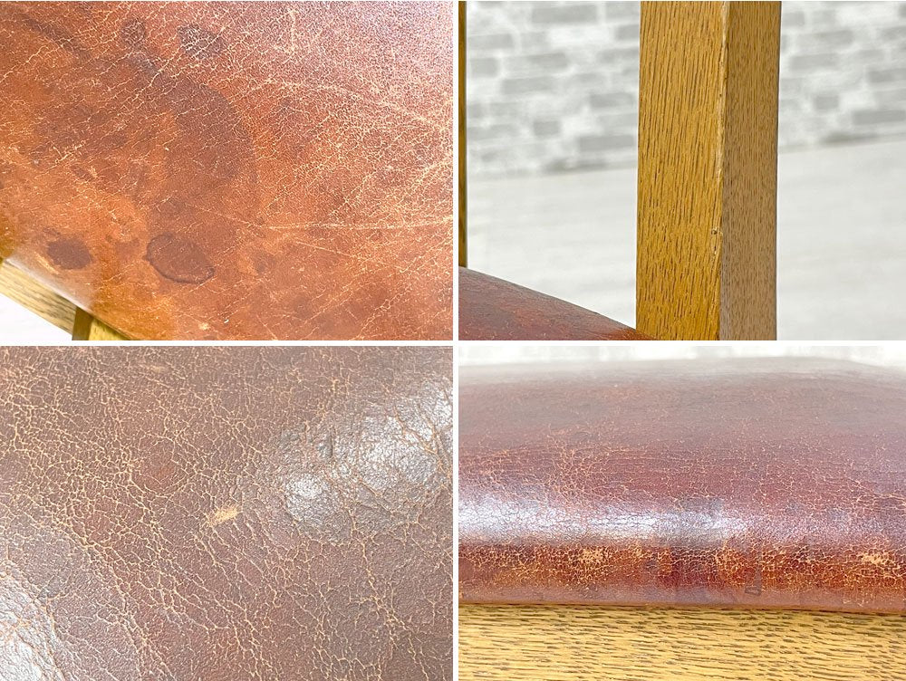 トラックファニチャーの代名詞ともいえるナラ(オーク)の無垢材が持つ生命力あふれる杢目。イギリスのアンティーク家具にも使われているように使い込む事で味わいが増してゆく素材に同じく味わい深いレザーがシートに張り込まれています。