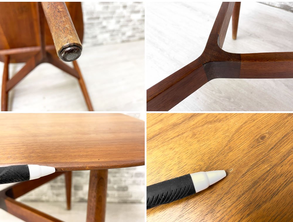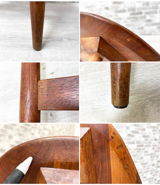 こちらはビンテージのお品物になります。使用に伴い、線傷や打痕、擦れ、部分的に落としきれない汚れがございますが、その他グラつきやガタツキなど使用上問題となるダメージはございません。天板は弊社工房にてサンディングを行った上、ワックスにて仕上げを施しておりますので、今後も滑らかな木肌をお楽しみ頂きながらご使用頂けます。