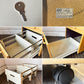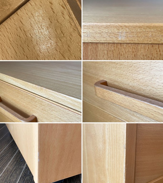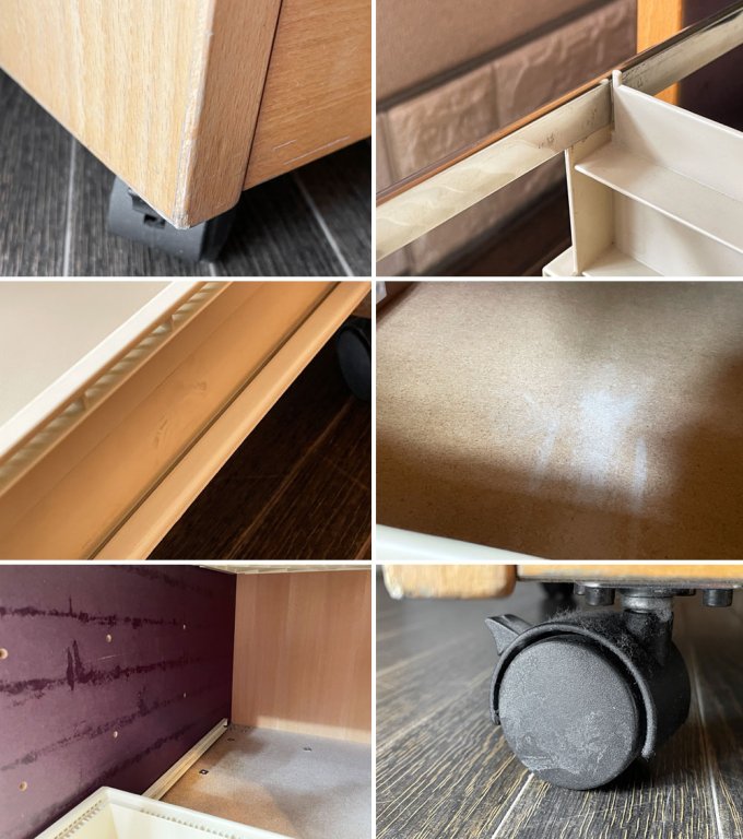 全体に傷や打痕、擦れ、落としきれない汚れ、天板の表面塗装の一部に剥がれが見受けられます。また、本体内部の底面に木肌の剥がれが確認できるとともに、金属部分にはくすみが生じていますが、その他、抽斗やキャスターの動作はスムーズでぐらつき等もございません。今後も安心して実用頂けるコンディションを保っています。