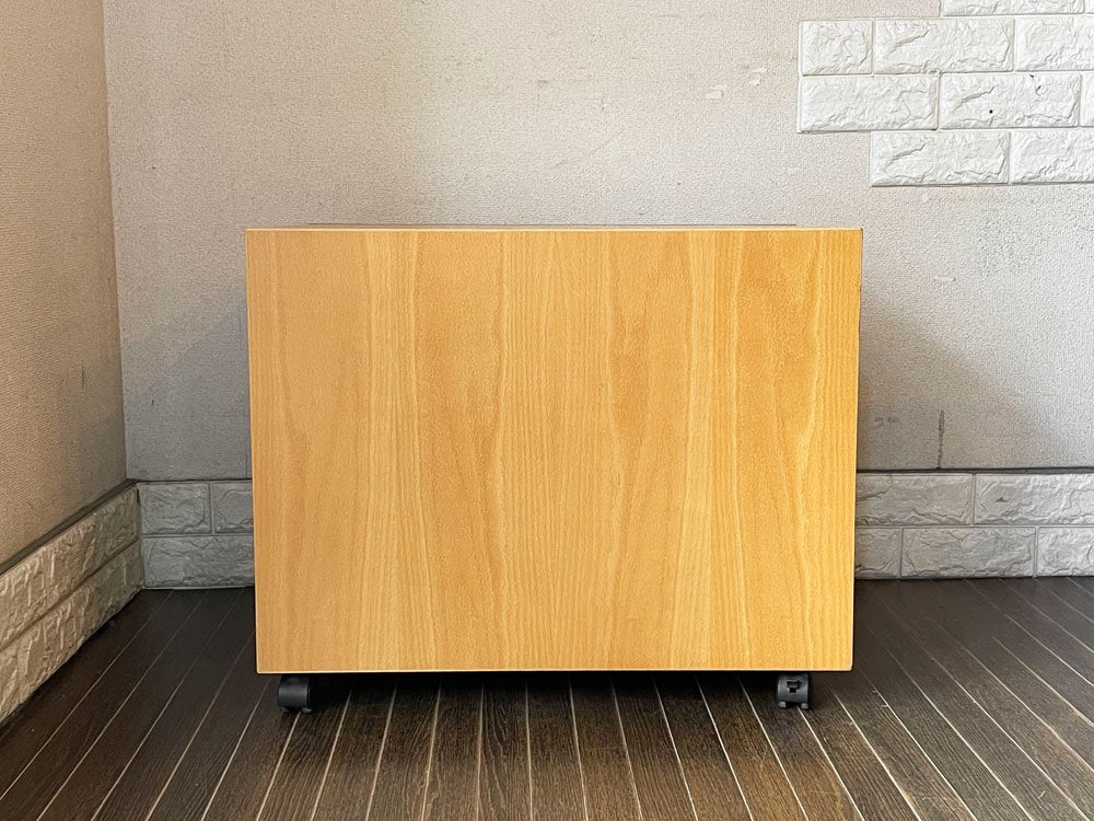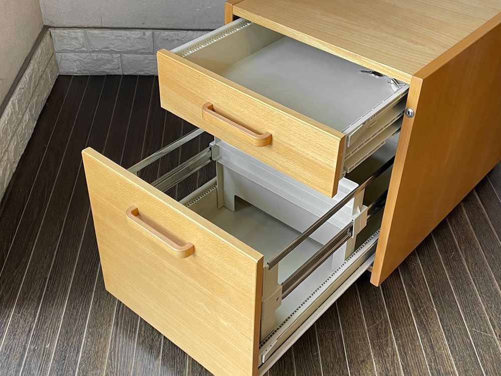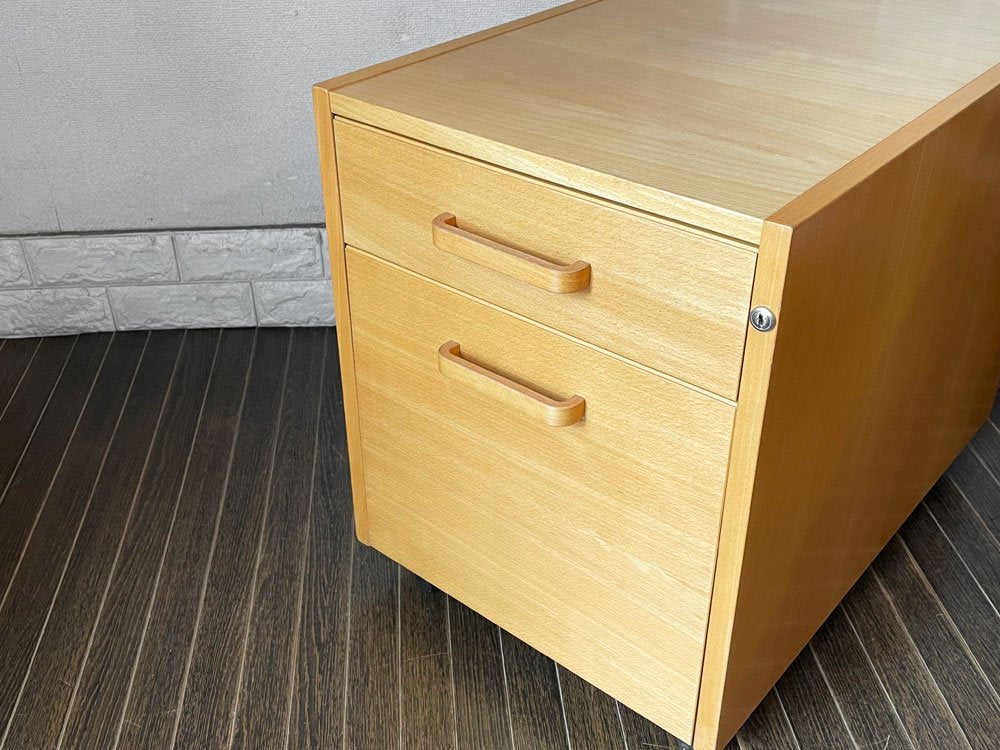 こちらは、ナチュラルなビーチ材の2段デスクキャビネット。装飾のないシンプルなデザインが素材感を際立たせています。