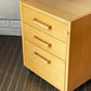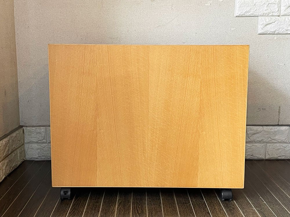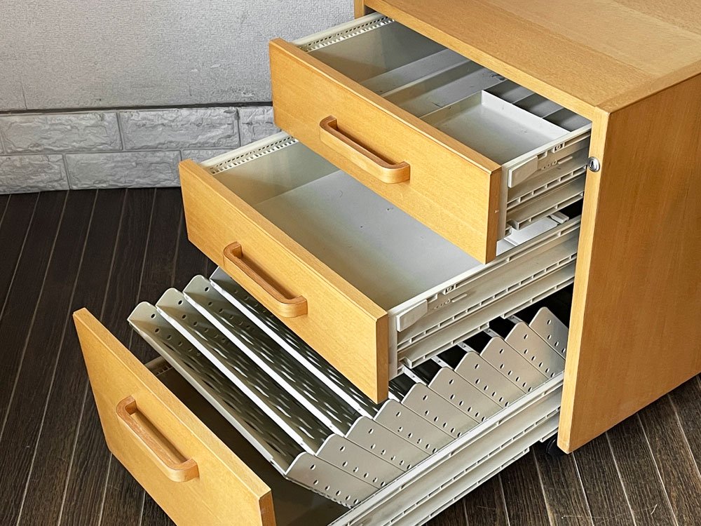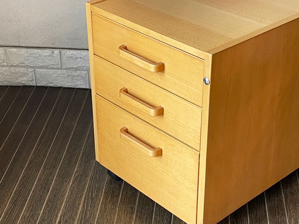 こちらは、ナチュラルなビーチ材の3段デスクキャビネット。装飾のないシンプルなデザインが素材感を際立たせています。