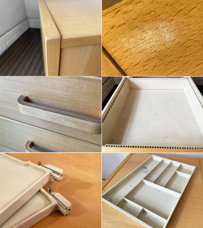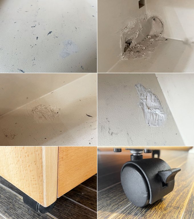 全体に傷や打痕、擦れ、落としきれない汚れ、天板の表面塗装の一部に剥がれが見受けられます。また、抽斗内部にはボンドやゴムなどが付着した痕が複数確認できるとともに、2段目の抽斗内には付着物を削り取った際に出来たと思われる穴がございます。なお、仕切り板は2枚とも爪が破損しています。本体に差し込むことができず、固定されませんこと予めご承知おきくださいませ。その他、抽斗やキャスターの動作はスムーズでぐらつき等はございませんが、使用感を加味し、通常よりおp求めやすい価格での販売となります。この機会にぜひ、ご検討くださいませ。