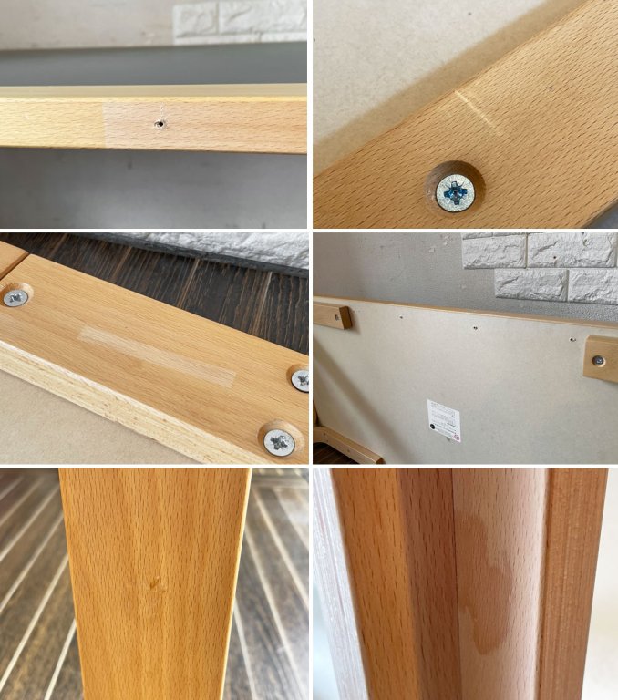 こちらはビンテージのお品物です。全体に傷や打痕、擦れ、落としきれない汚れが見受けられます。また、リノリウム天板には圧着痕や黒ずみ、色ムラ等が確認できるとともに、天板側面のビス穴やシール痕がやや目立ちます。その他、ペン痕や脚部のシミ汚れ等全体に若干の使用感が感じられます。なお、片側の幕板が欠品しておりますが、実用に問題はございません。ぐらつきや割れ、軋み等の大きなダメージはなく、これからも安心してお使い頂けるコンディションを保っています。