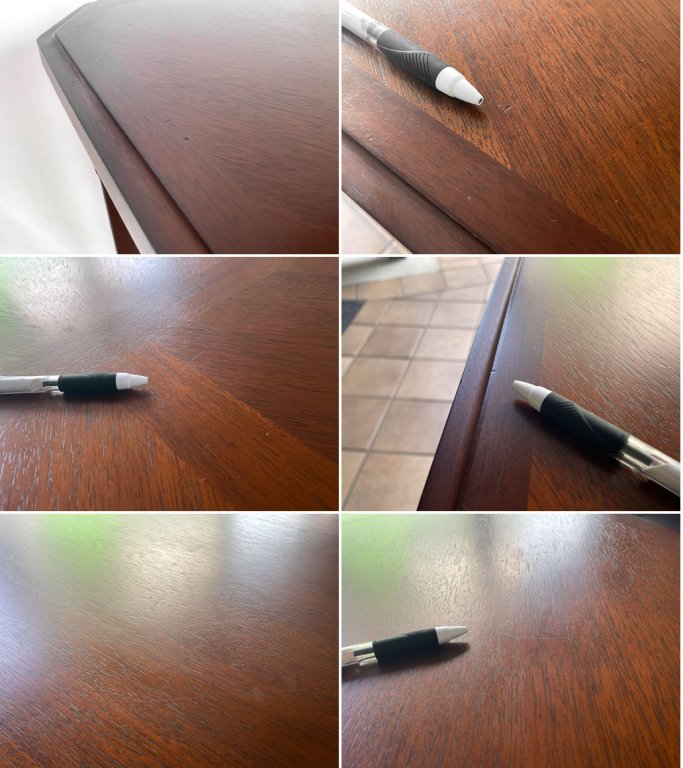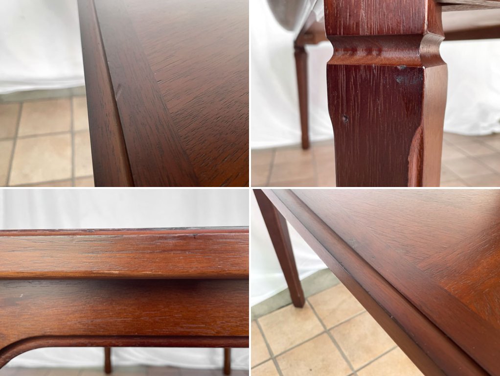使用に伴い天板と脚には細かな打痕や線傷が複数箇所見受けられますが、目立つものではございません。その他割れやガタツキ等使用上問題となるダメージも見受けられず、中古品としましては概ね良好なコンディションを保っております。