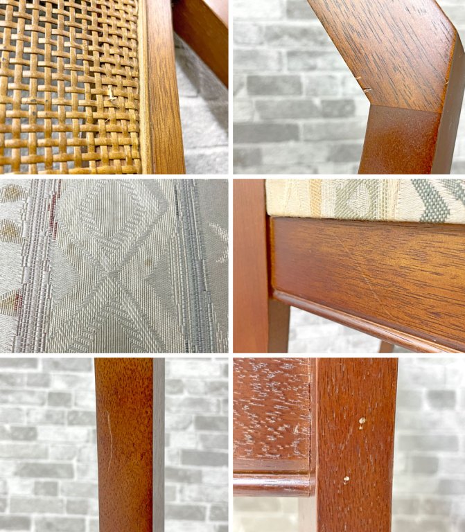 両脚ともに、使用に伴う軽微な線傷や打痕がフレームに散見され、ファブリックには所々シミが見受けられます。背もたれのラタン部分は、微細な欠けや割れはございますが、穴などの目立ったダメージは見られません。