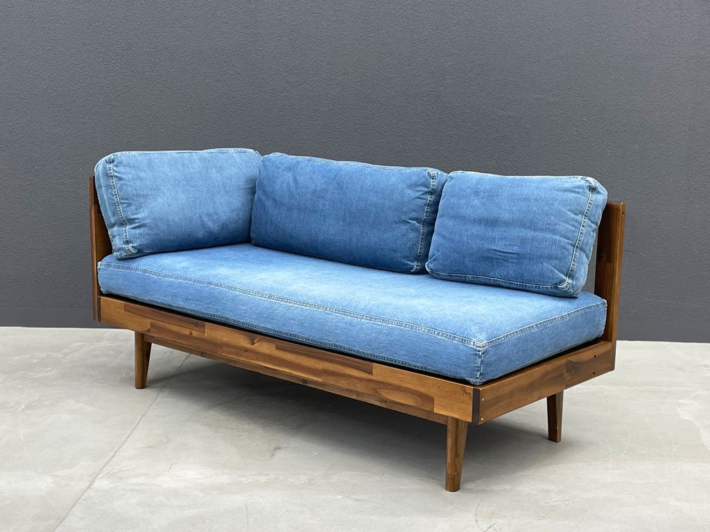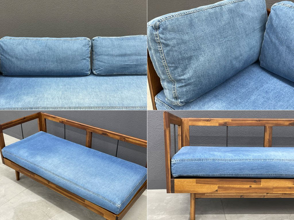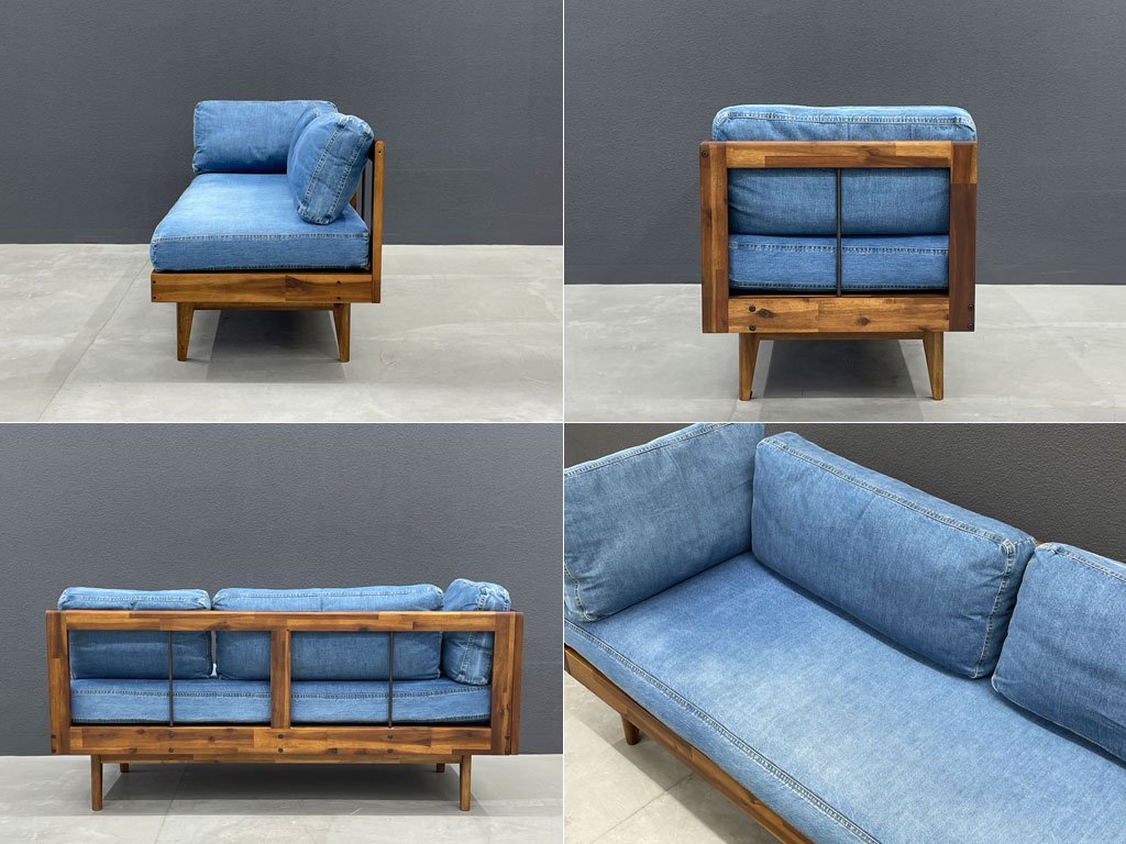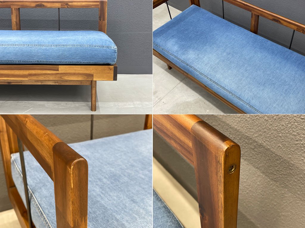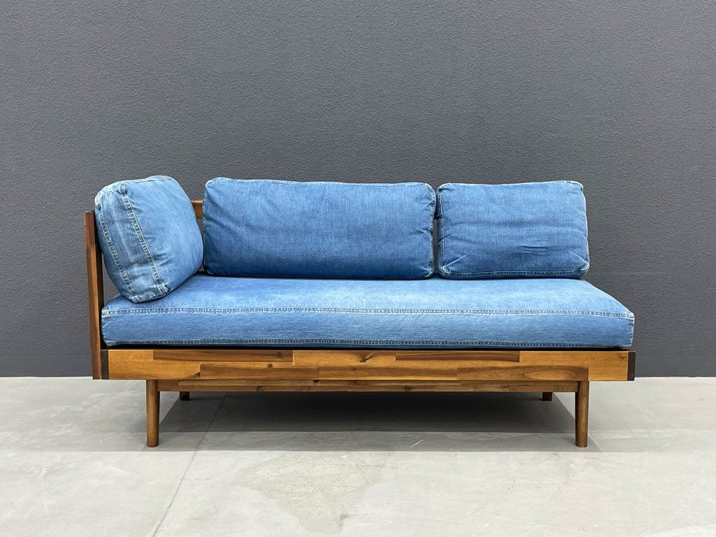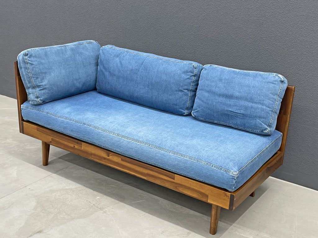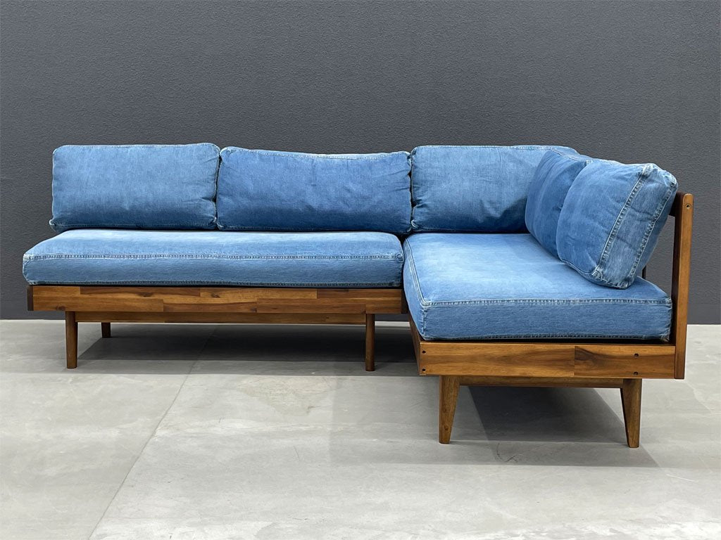 自然の風合いを感じられるアカシア無垢材フレームと西海岸を感じさせるラフで爽やかなデニム生地を組み合わせたビンテージ感を感じさせる扱いやすい組み合わせ。