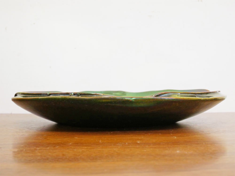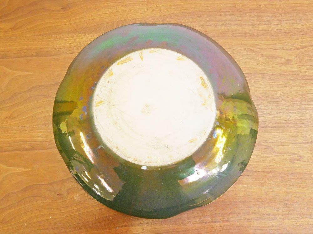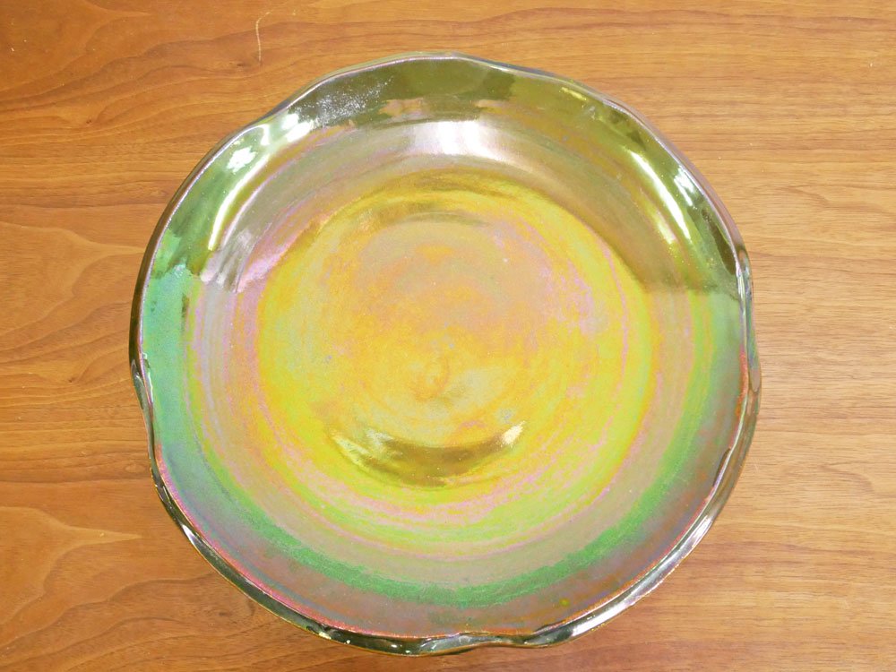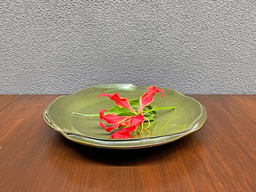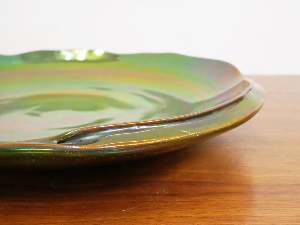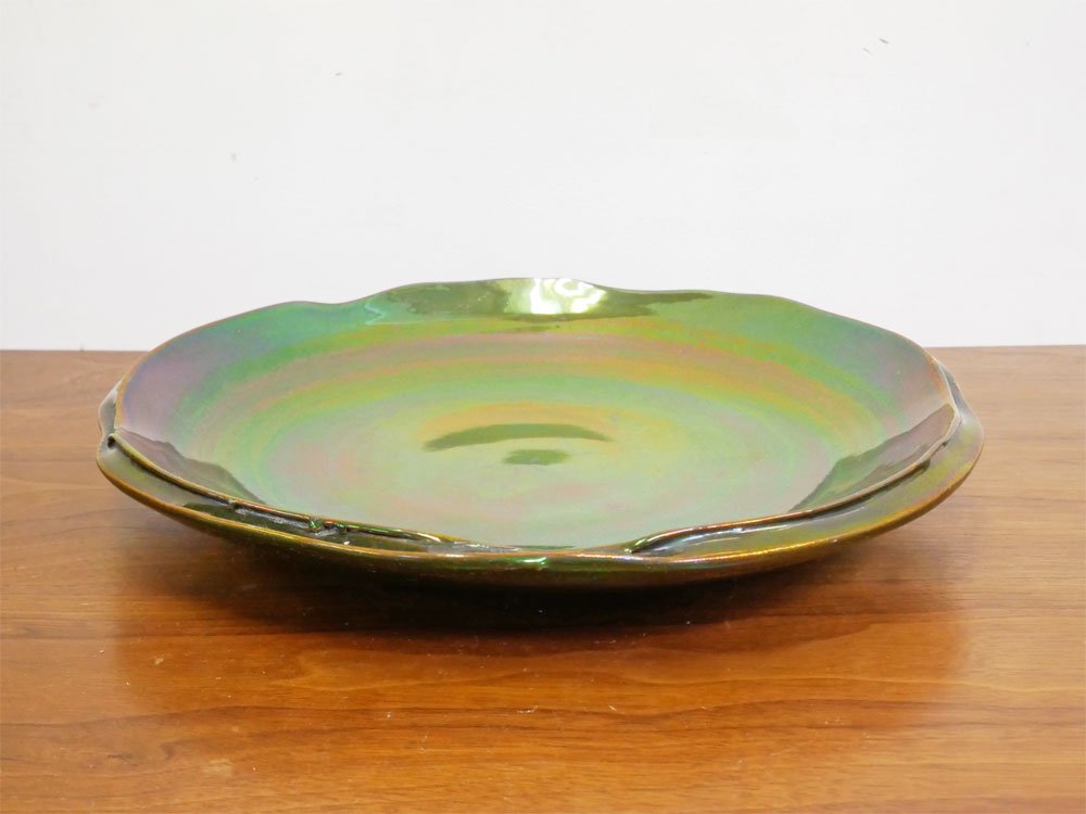 こちらは、不思議な輝きに目が奪われるグリーンのラスター釉が施され、見る角度によって色が変化するユニークな逸品。飾り皿としてはもちろん、パーティ用の盛付け皿としてもお使い頂けそうです。