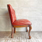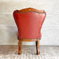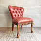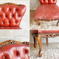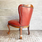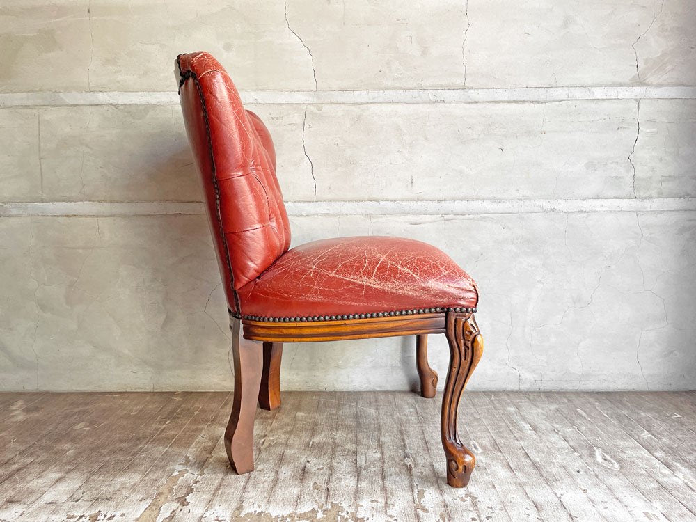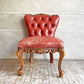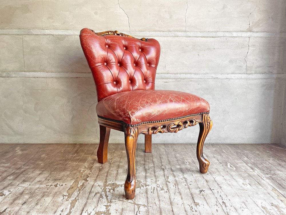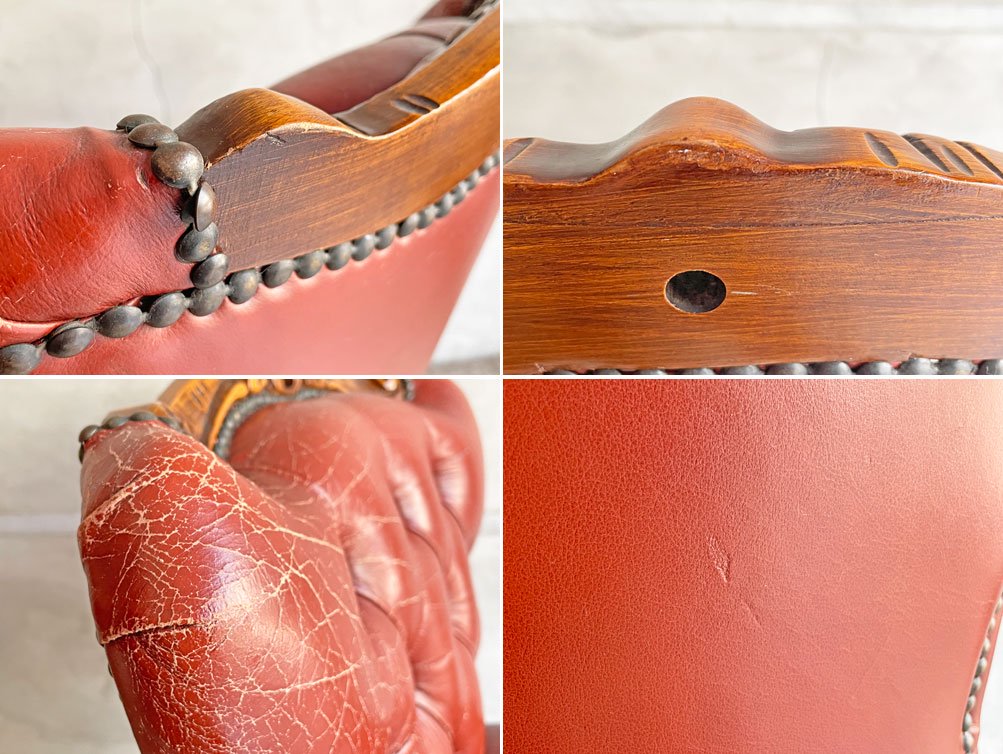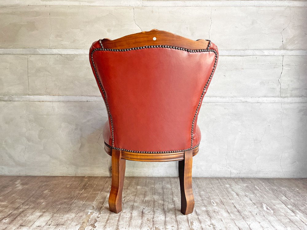 イギリスのビンテージアームチェア。クラシカルなフレームデザインに対して、赤いレザーシートに施されたスタッズがハードな印象に仕上がっており、雰囲気抜群で重厚感のある一脚です。