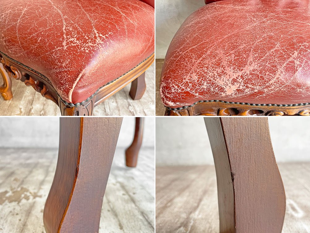 経年使用に伴なうレザーのひび割れや凹みのほか、木製フレームの傷や打痕が見受けられます。ご使用頂く上で問題となるようなダメージは無く、ビンテージ品として概ね良好なコンディションを保っております。