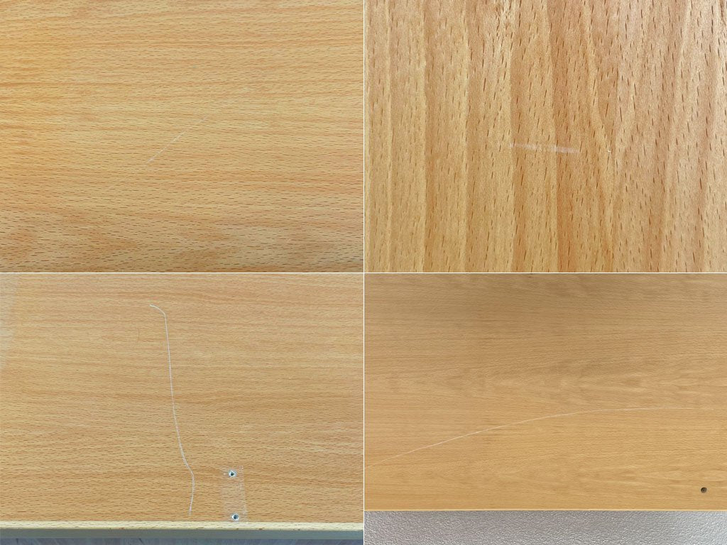 使用に伴う擦れや傷、打痕、天板のネジ穴痕、シール痕などが見受けられます。