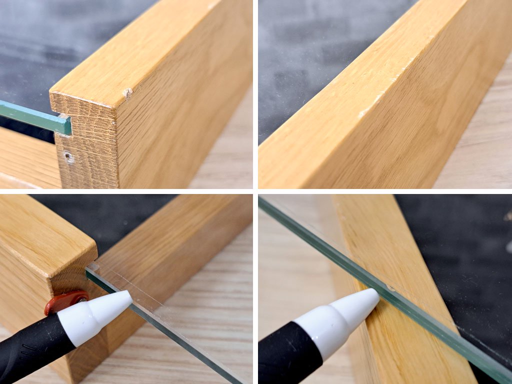 また、ガラス天板の両端の縁にはスライドした際に出来る擦れ傷と、僅かなチップが一箇所があるものの、通常時は溝に隠れているため、気にならない程度かと思われます。