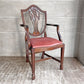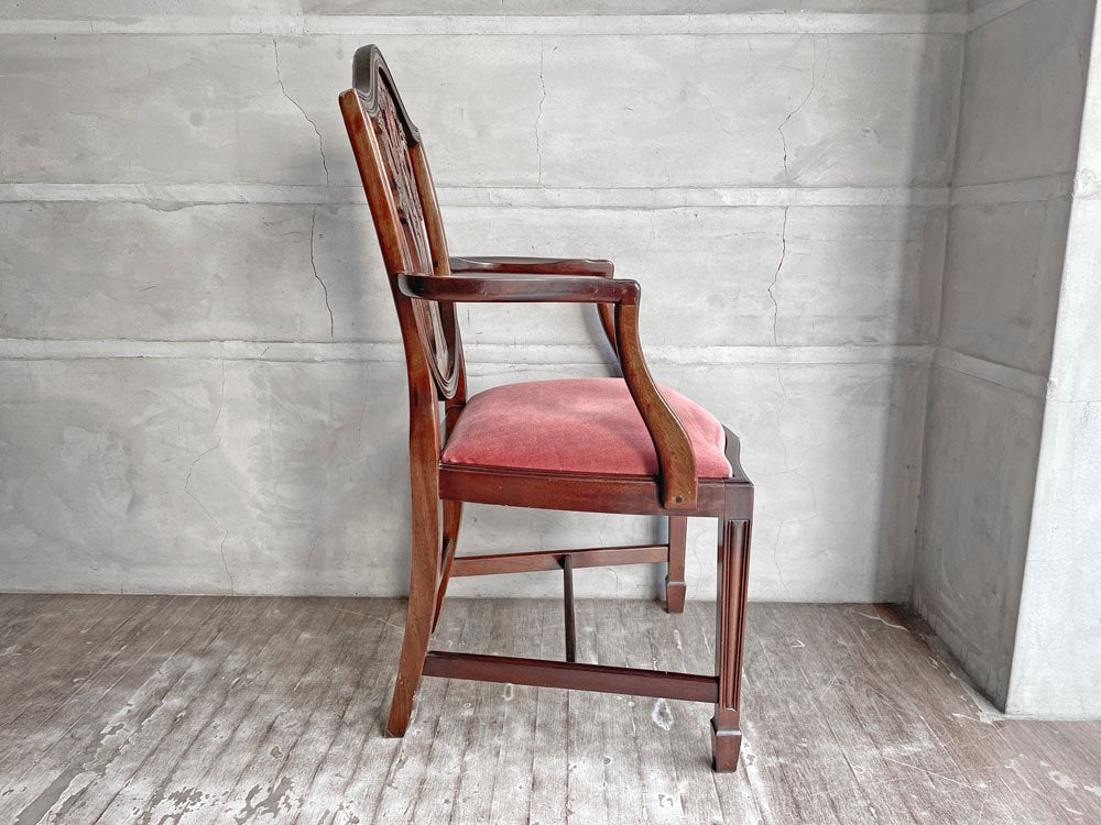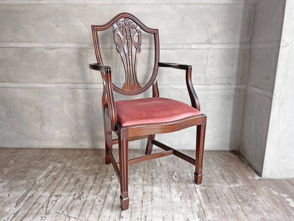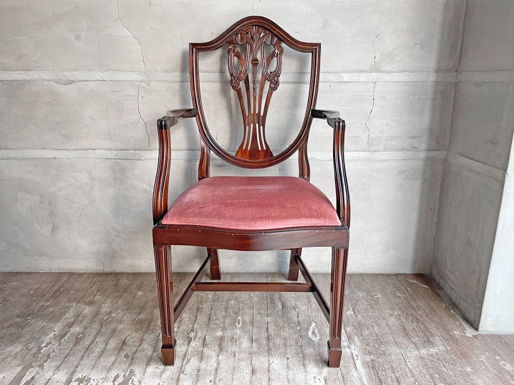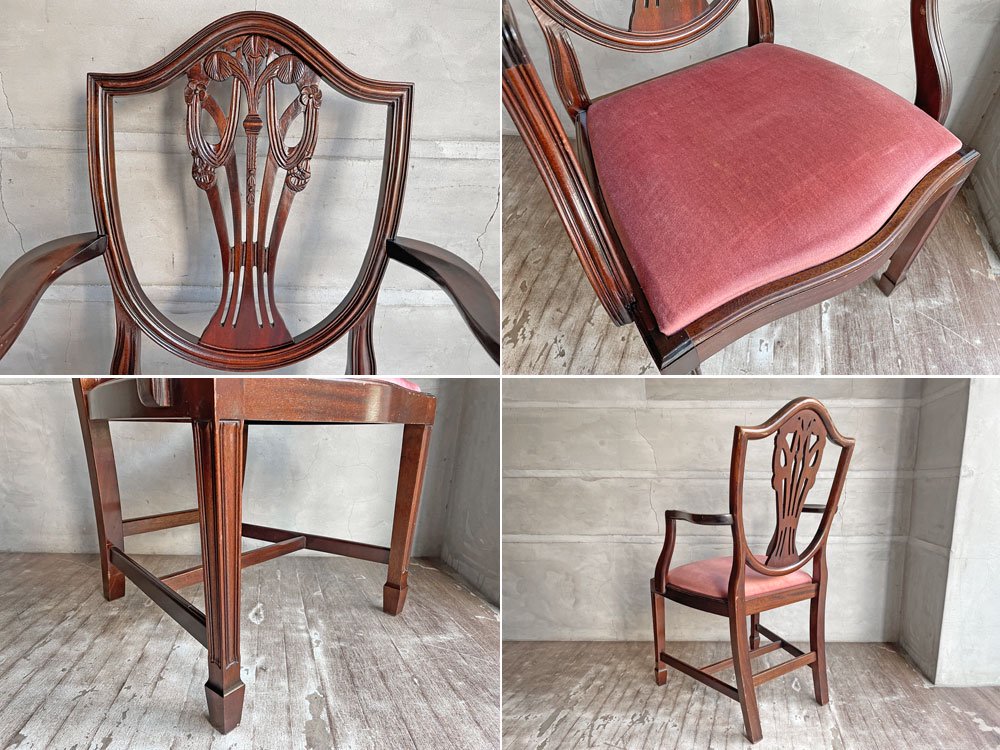 ヘップルホワイトチェアは、18世紀後半の家具作家であるジョージ・ヘップルホワイトが確立したスタイルの様式です。盾のようなフォルムの背もたれが特徴的で、彫り込みによる繊細な装飾が非常に美しくあります。