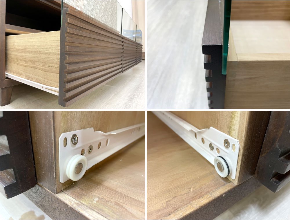 抽斗前面は格子状にデザインされ、居住空間に溶け込む都会的な雰囲気を演出してくれます。抽斗と一緒に開閉する上部のガラス面により、閉じた状態でもリモコン操作が可能。埃の侵入もある程度防いでくれます。