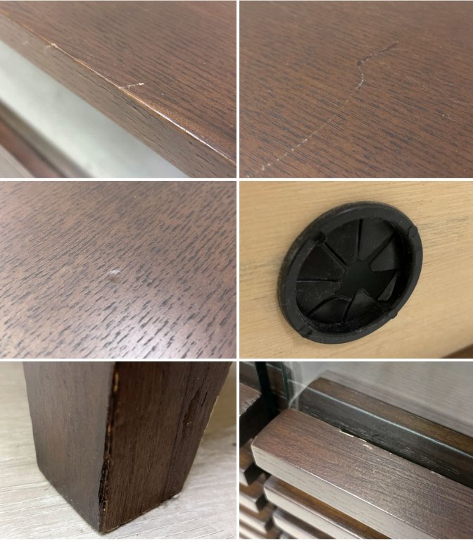 天板の各所に打痕や線傷、それに伴うペイントロスが見受けられます。また、脚部にも同様のダメージが多く見受けられ、抽斗のスライドレールに備わった滑車は2箇所ゴムリングが欠品しております。