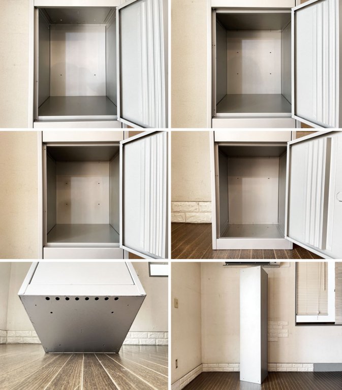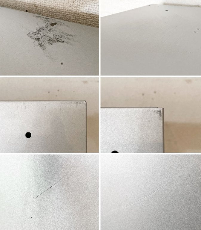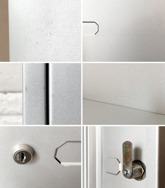 使用に伴う、擦れや打ち傷、表面塗装の剥がれや錆、取り切れない汚れ等が本体や庫内など全体に散見されます。やや天面の塗装剥がれが目立ちますが、高さがあるためご使用時にはさほど気にならないかと思われます。また、鍵には金属特有のくすみや錆が見受けられますが、施錠には支障はございません。やや使用感はございますが、ロッカーとしてのご使用に問題はなく、これからもまだまだ実用頂けるコンディションを保っております。