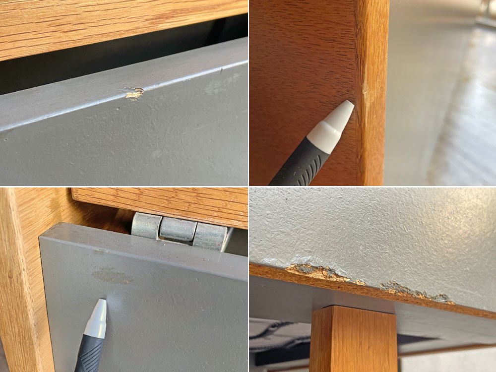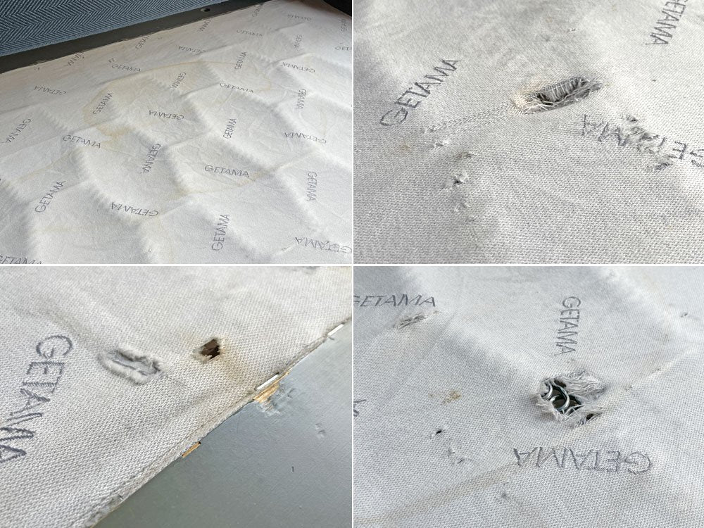 フレームには打痕や擦れ、線傷やペイントロスが見受けられます。背もたれ部分のファブリックに薄染み、座面下スプリングカバーにはやや目立つ染み、破れが散見されますがご使用頂く上では見えない部分となるため然程気にならないかと思われます。