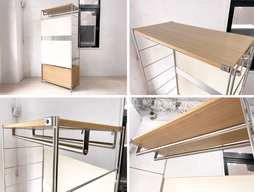 ステンレスユニットシェルフ オーク材 ワードローブバー2本&バックパネル&引き出し付き