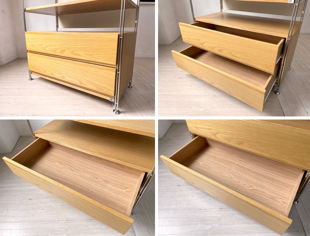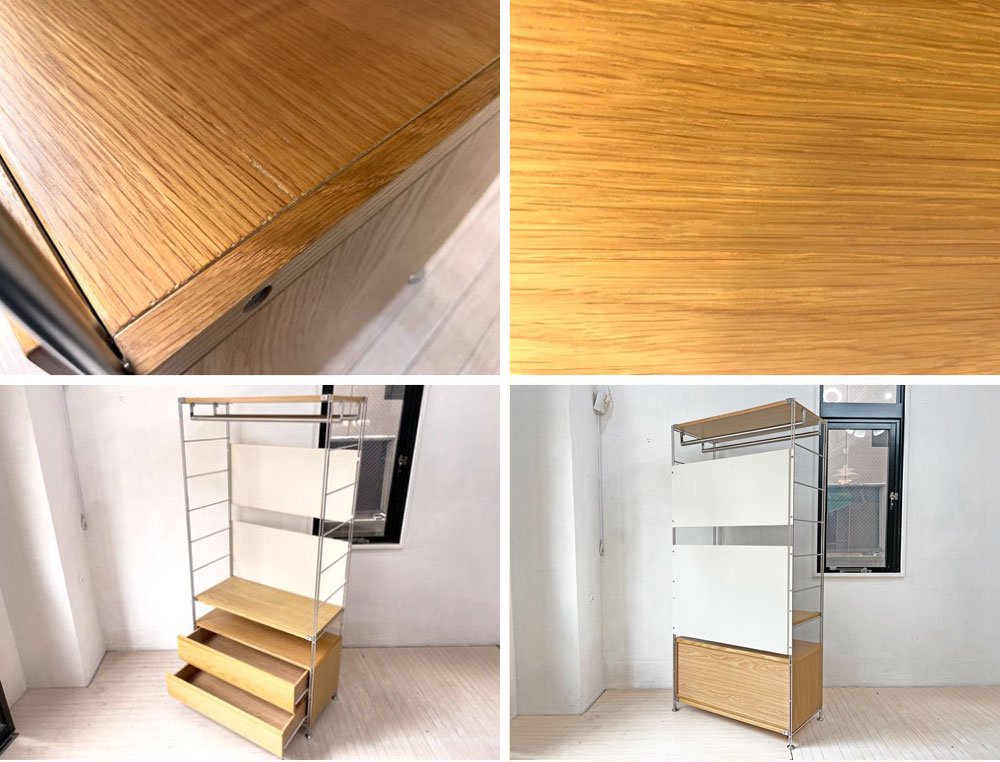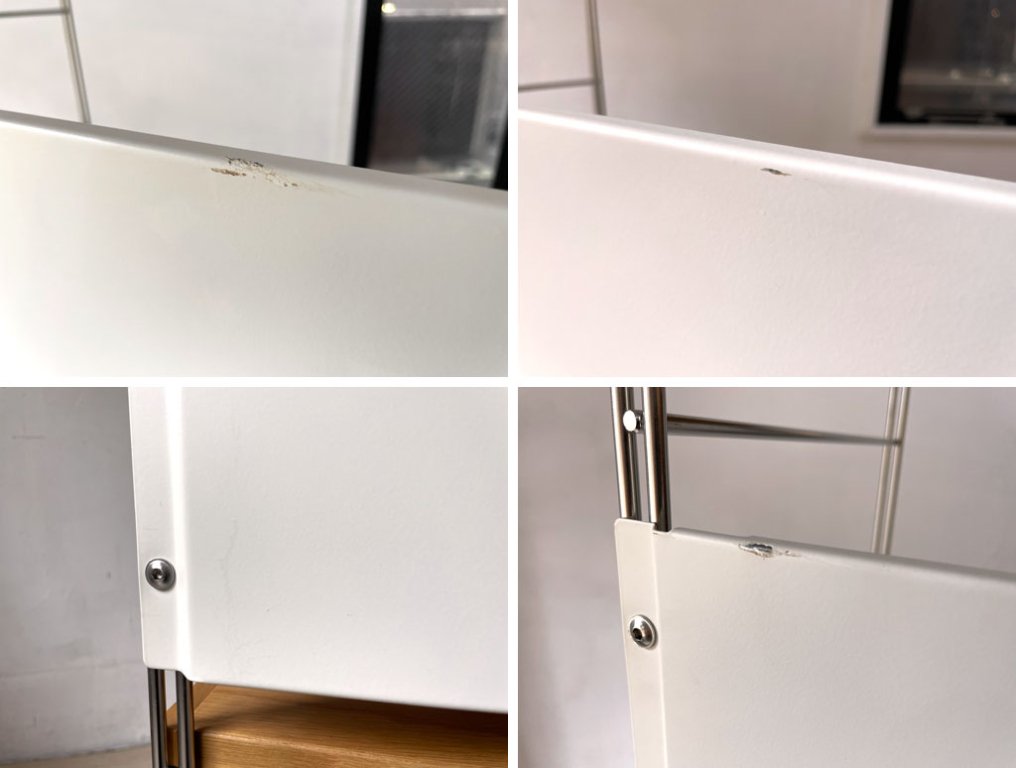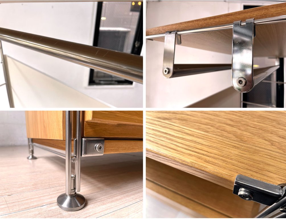使用に伴う多少の傷やスレ、軽微な突板の剥がれ、ステンレスの僅かなくすみなどがございます。また、最上段の棚板のみオーク材ではなくタモ材の棚板となっております。その他、大きく目立つようなダメージなども無く、ご使用に問題のある箇所などもございません。USED品として概ね良好なコンディションを保っております。