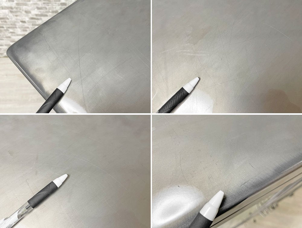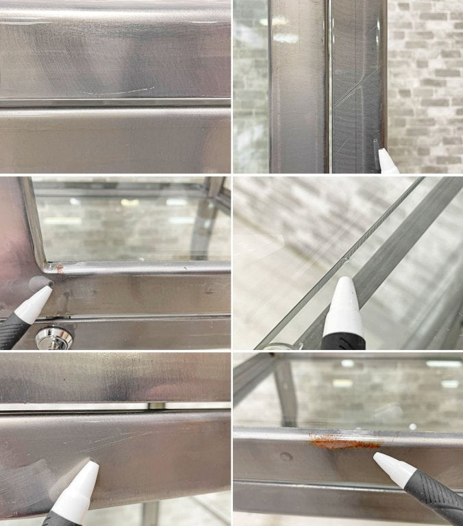 使用に伴う擦れ傷の他、天面を中心にスクラッチや線傷、塗装内部の錆びが僅かに見受けられますが、いずれも大きく目立つものではございません。ガラス棚板にはペン先程のごく小さなチップは見られるものの普段触れる箇所にはなく、今後とも気持ちよくお使いいただけるUSED品として概ね良好なコンディションを保っております。