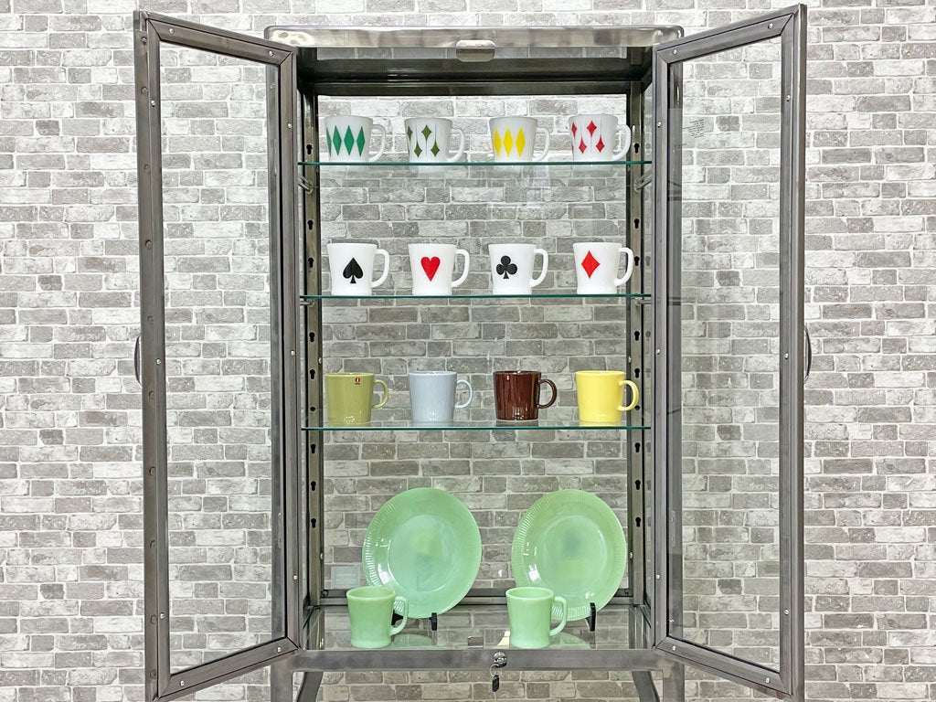 こちらは同社の定番プロダクト「ドクターキャビネットS」になります。薬棚等に使われる医療系家具をヒントにスチールフレームとクリアガラスで構成されたキャビネット。フレームの表面は金属本来の表情を残し、素地にクリアのコーティングを施したRAW仕上げ。シックで大人びたインダストリアルテイストを完成させています。