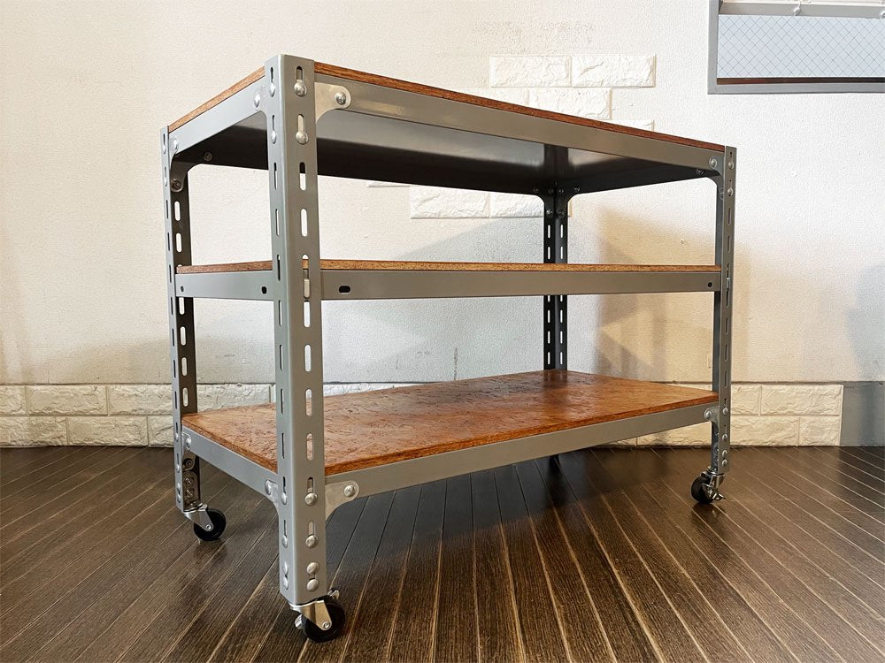 今回は定番のグレーカラーのフレームにカスタムで製作された木製棚板が付属し、ナチュラルさがプラスされることで無骨な雰囲気が和らいでいます。