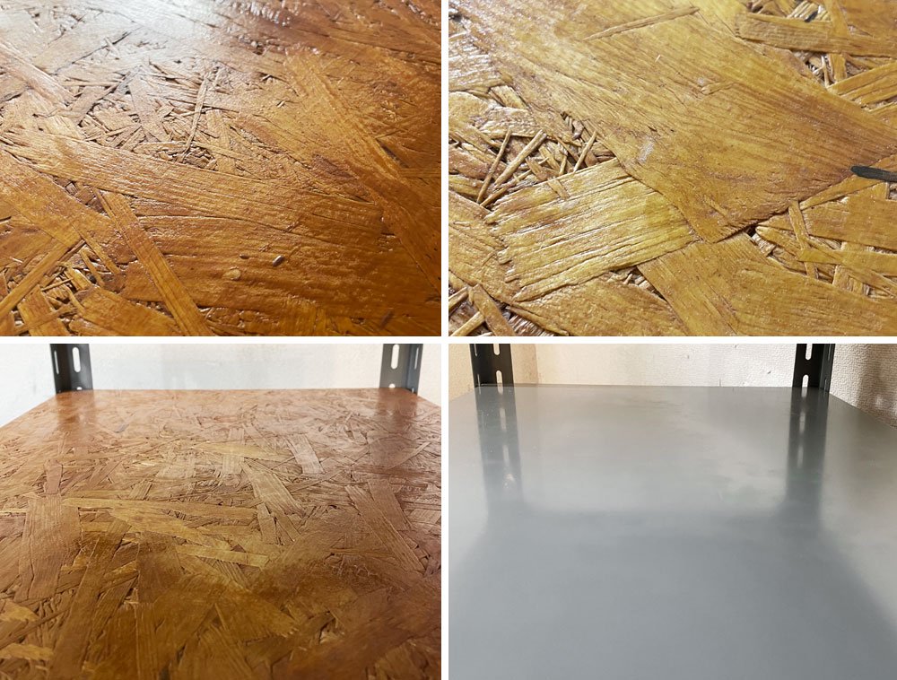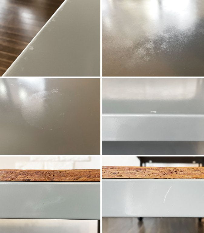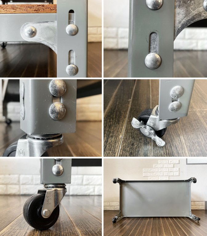 使用に伴いスチール部分には線傷や擦れ、傷が散見されます。また金具の白化やくすみ、取り切れない汚れのほか棚板は表面塗装の剥がれによるツヤ感のムラがございます。その他、木部には若干の擦れや傷、汚れはございますが、ぐらつきや歪みなどの使用上問題となるダメージは見受けられません。インダストリアルの風合いとしてお楽しみいただきながらこれからも実用いただけます。