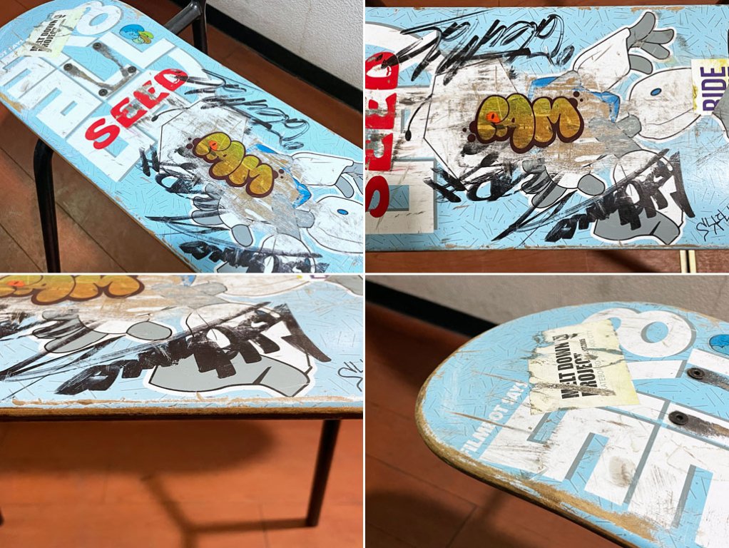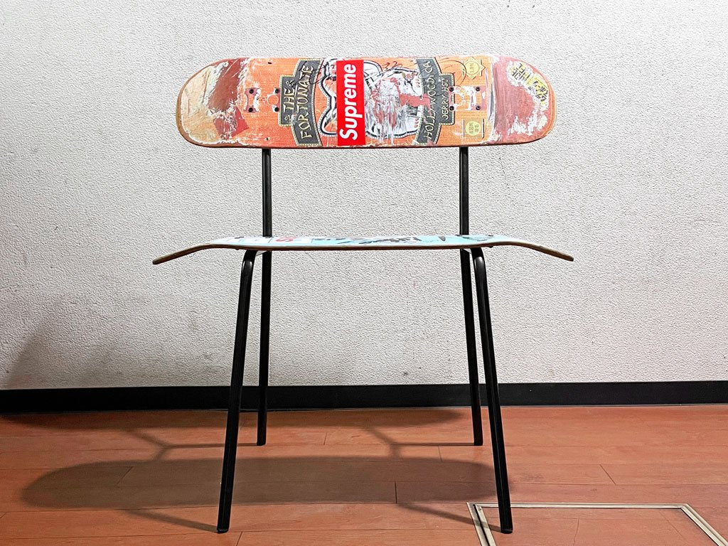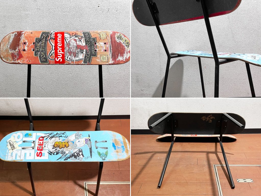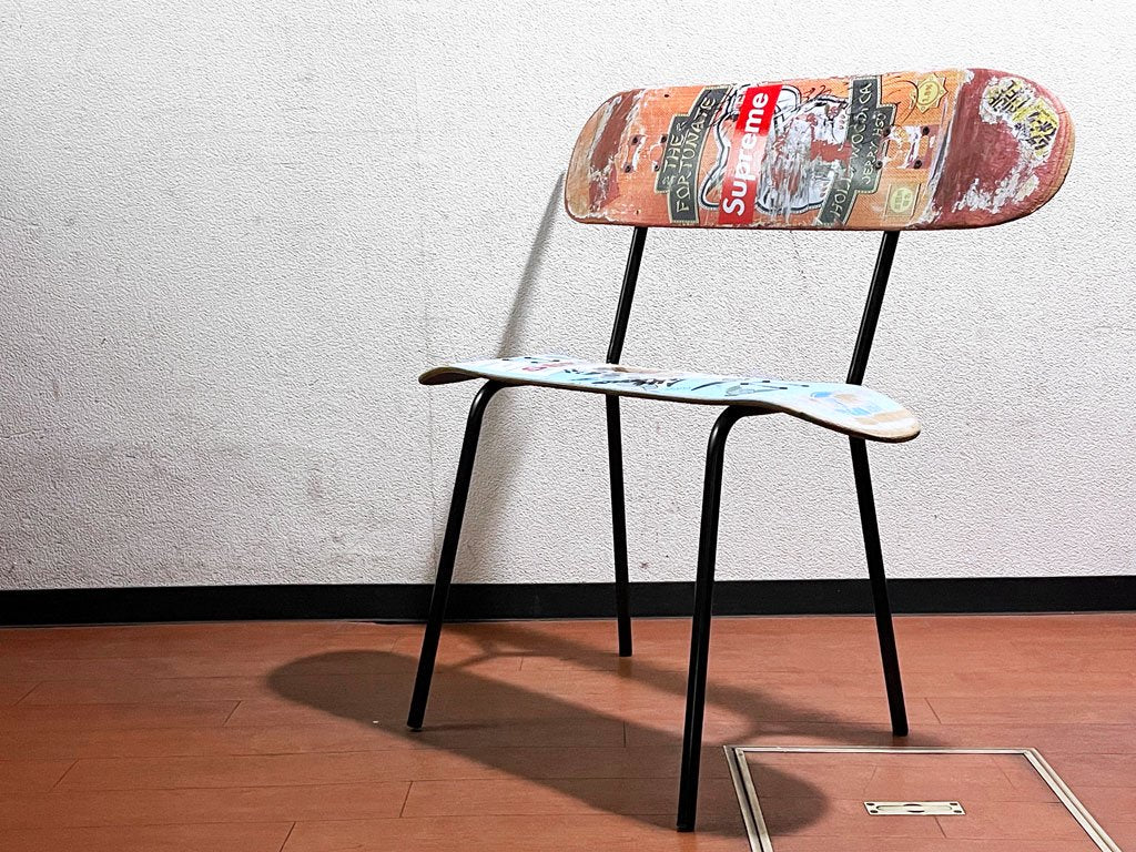 スケートボードのデッキをそのままシートに使用した斬新なデザイン、使い込まれたデッキがストリート魂を感じせる一点となっております。