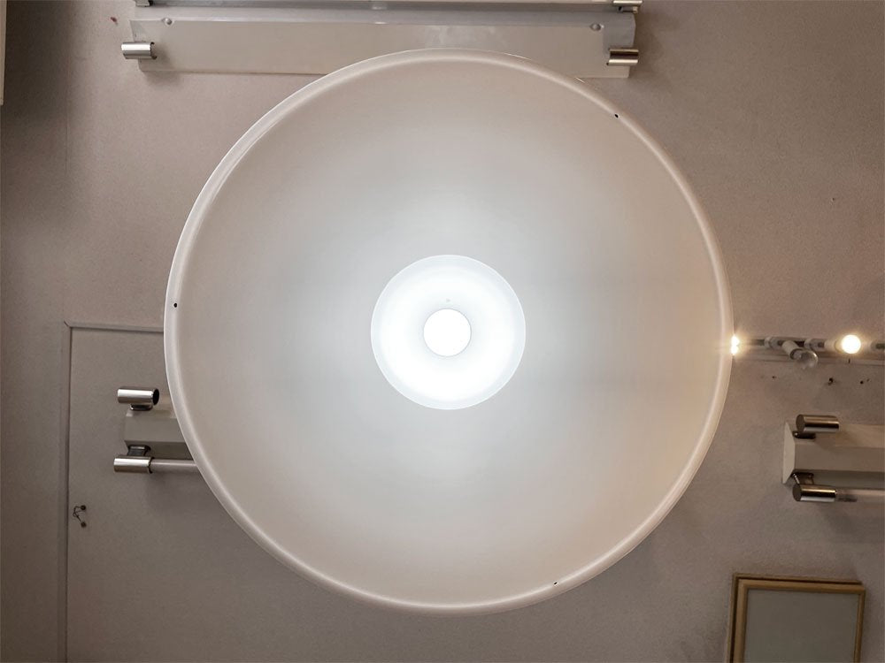 スポットライトの光が白い反射板を透過することで、下面を均一に照らし出すという繊細な光を生み出すフリスビー。